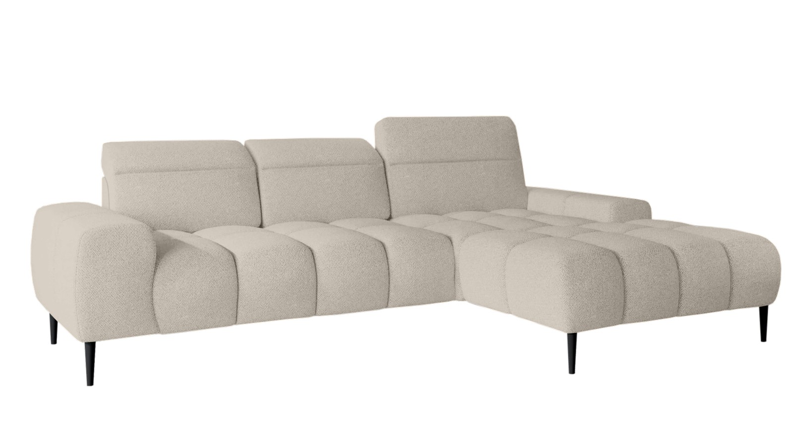 Pikowane siedzisko nadaje narożnikowi nowoczesnego charakteru, a wysokie metalowe nóżki w stylu loftowym dodają mu lekkości i elegancji.