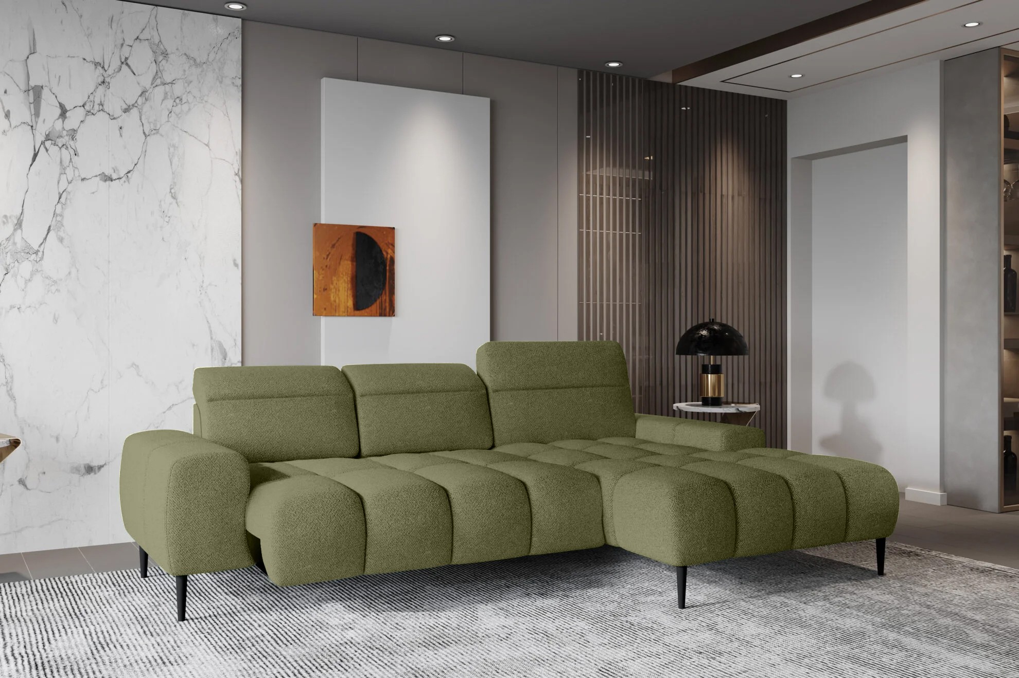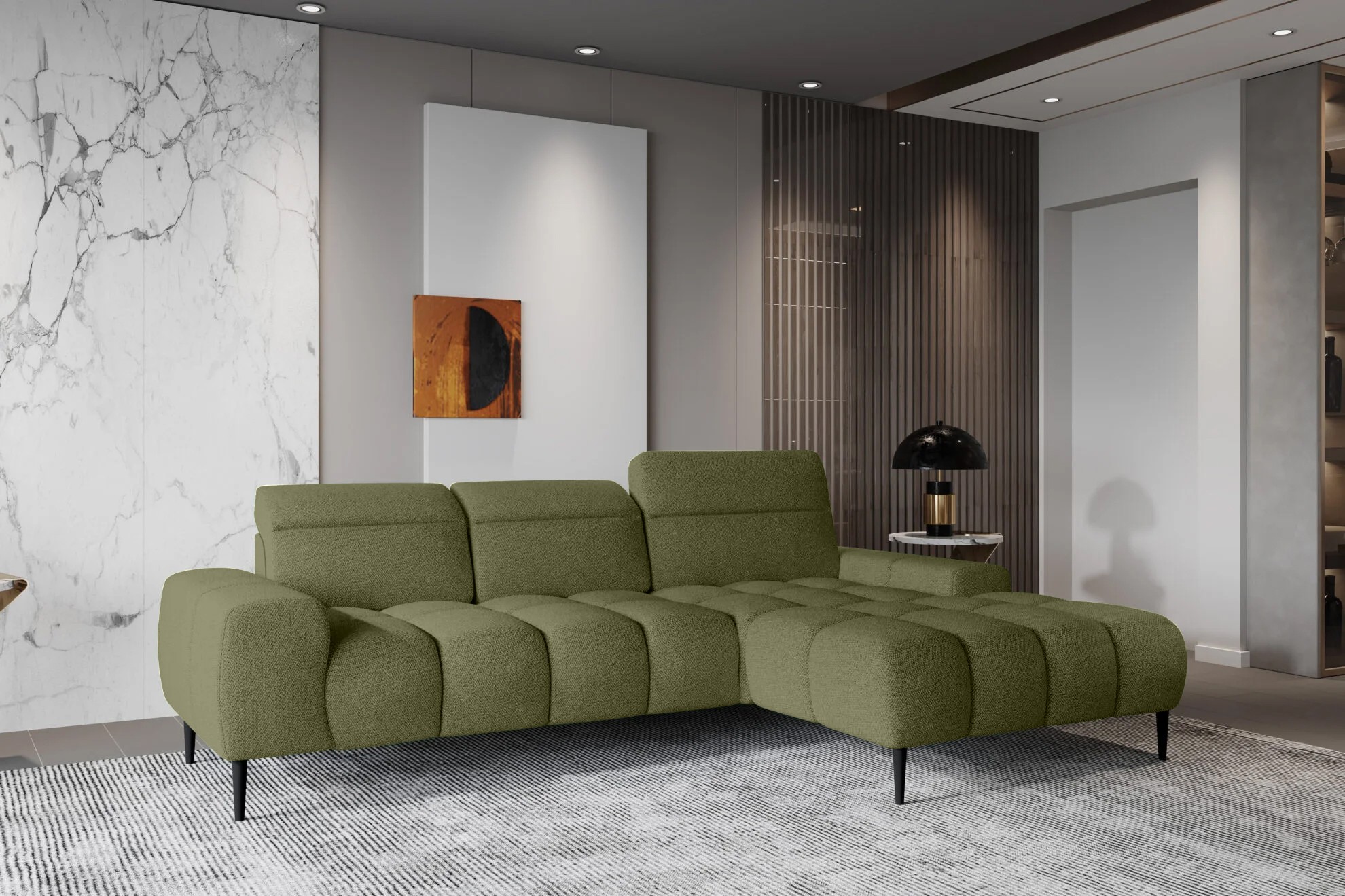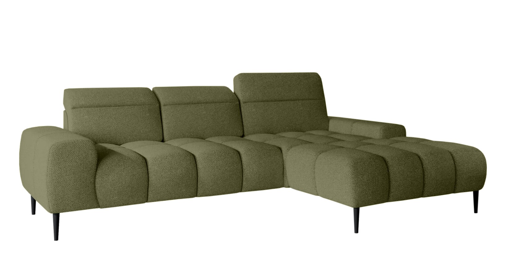 Pikowane siedzisko nadaje narożnikowi nowoczesnego charakteru, a wysokie metalowe nóżki w stylu loftowym dodają mu lekkości i elegancji.