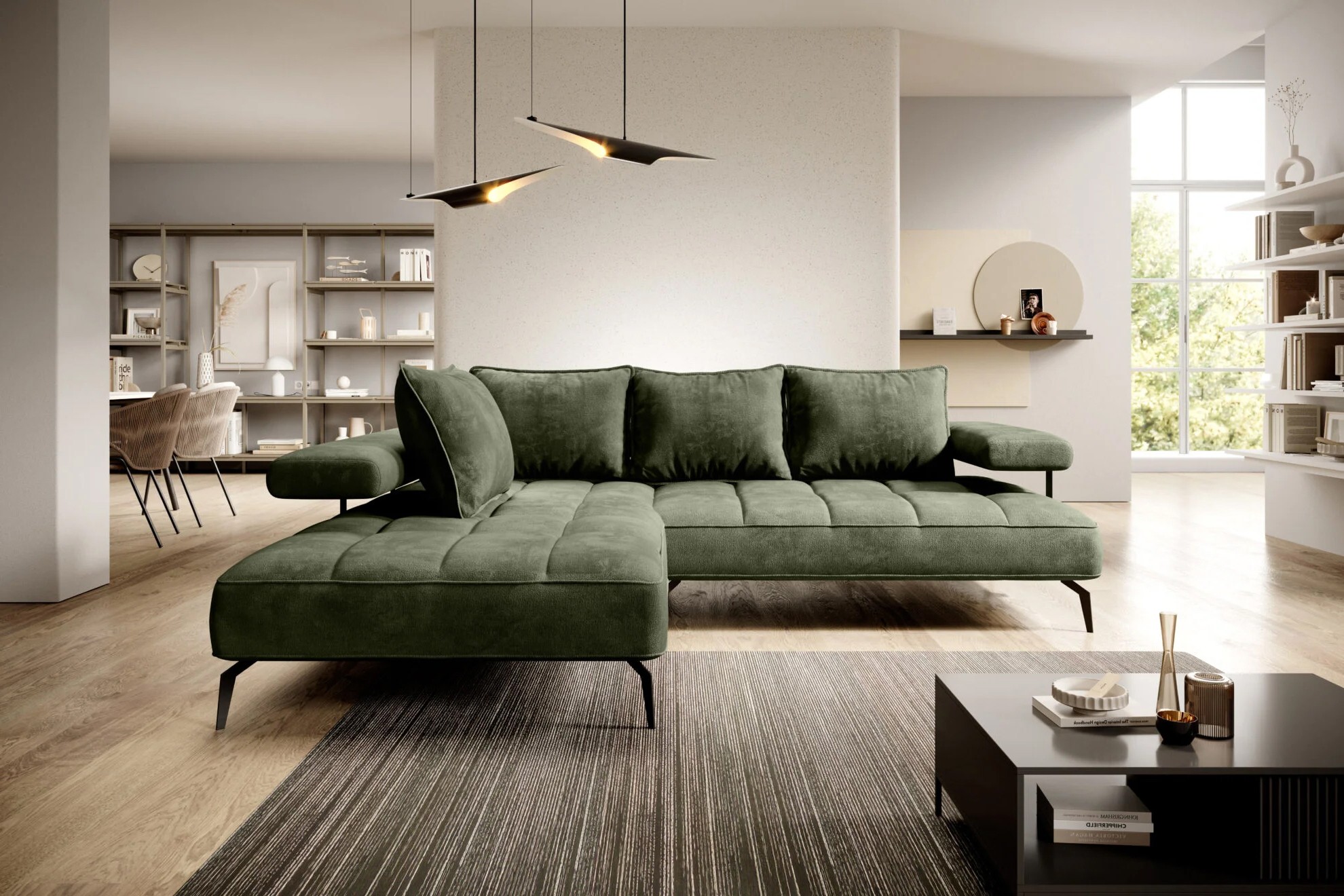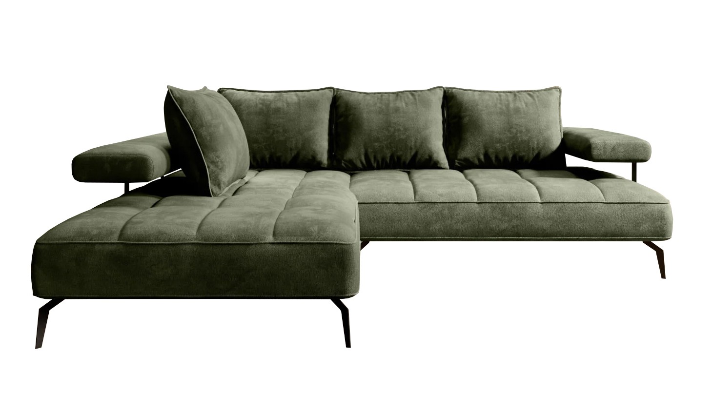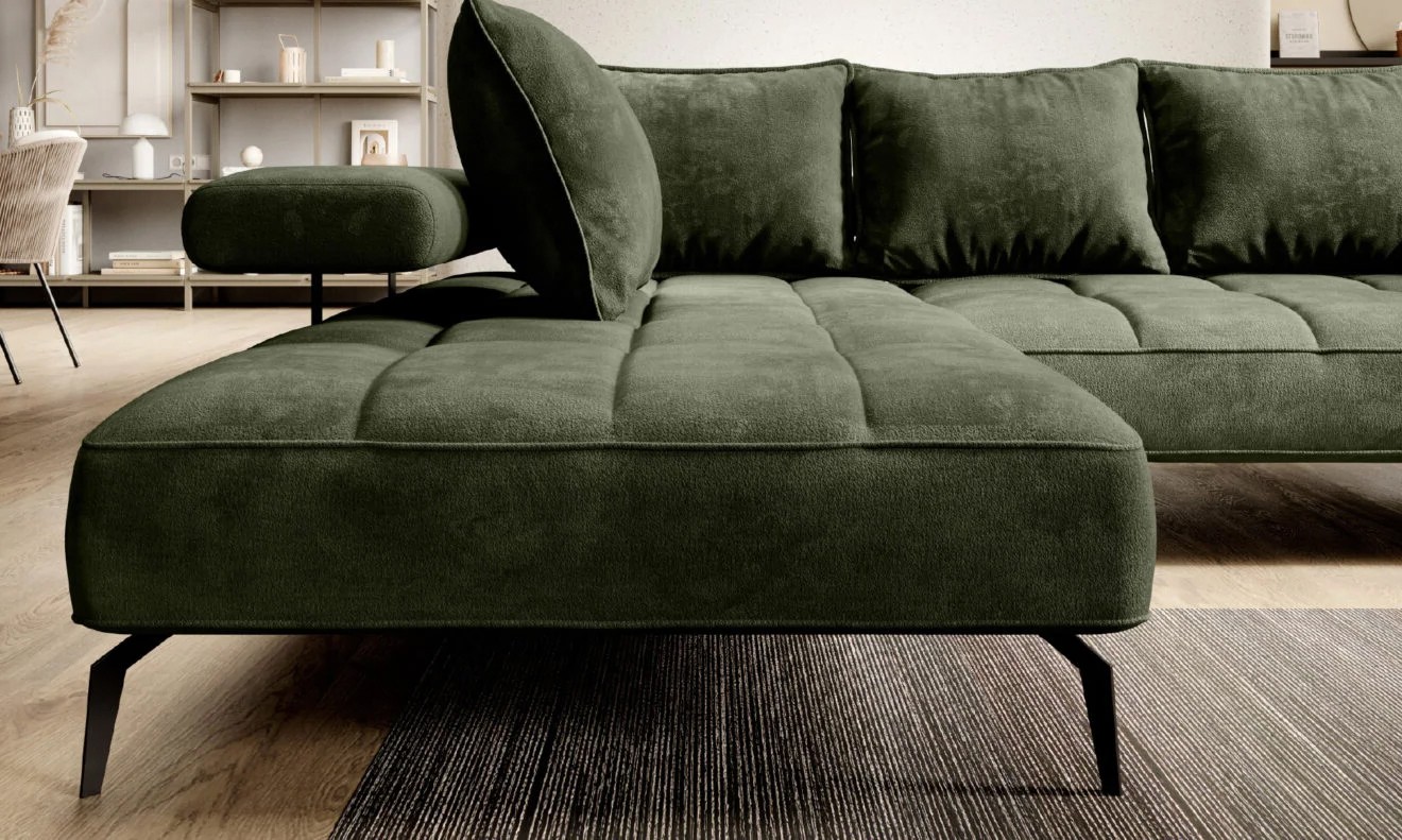 Stylowe pikowane siedzisko i wysokie metalowe nóżki nadają narożnikowi lekko loftowy, a jednocześnie nowoczesny charakter.