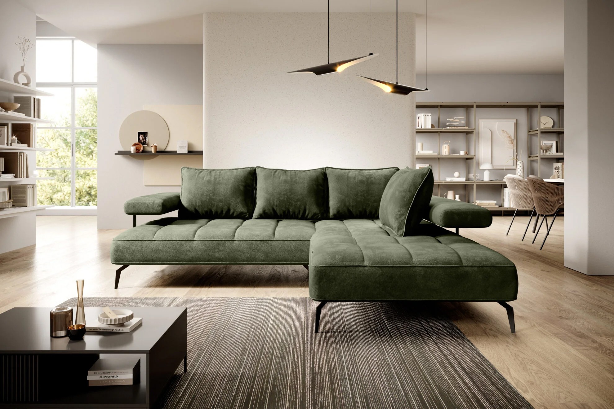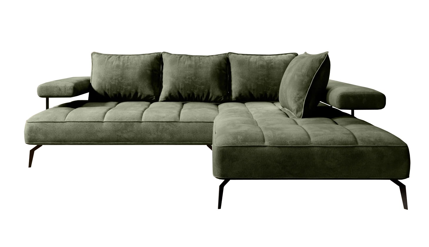 Stylowe pikowane siedzisko i wysokie metalowe nóżki nadają narożnikowi lekko loftowy, a jednocześnie nowoczesny charakter.