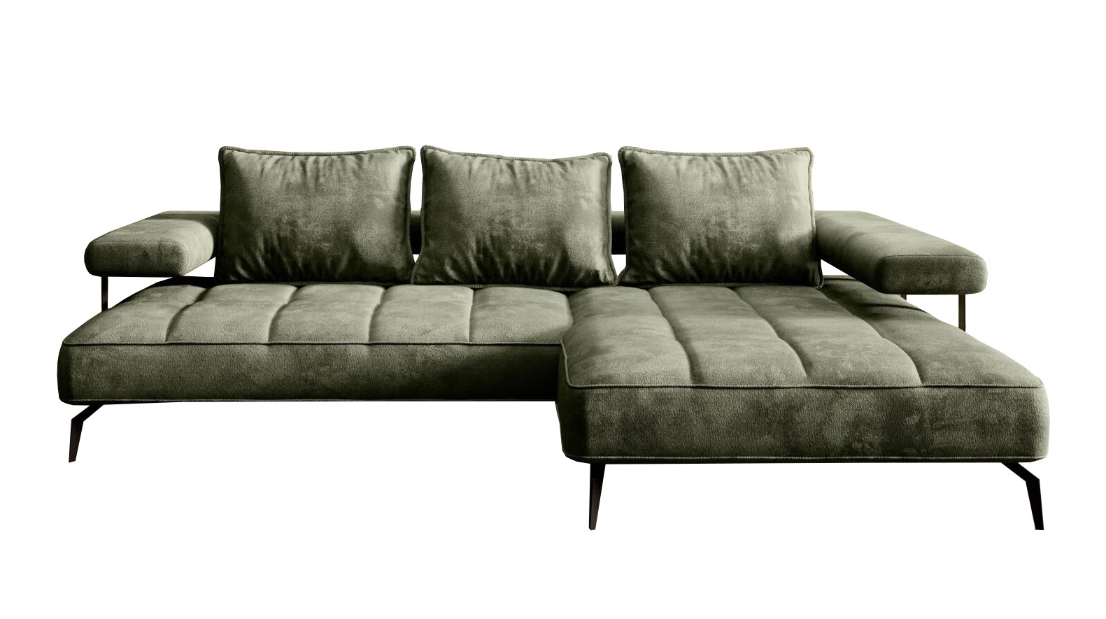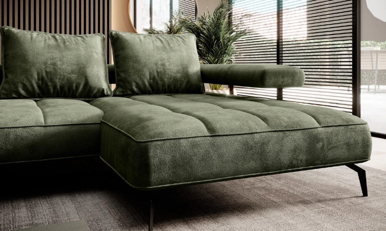 Stylowe pikowane siedzisko i wysokie metalowe nóżki nadają narożnikowi lekko loftowy, a jednocześnie nowoczesny charakter.