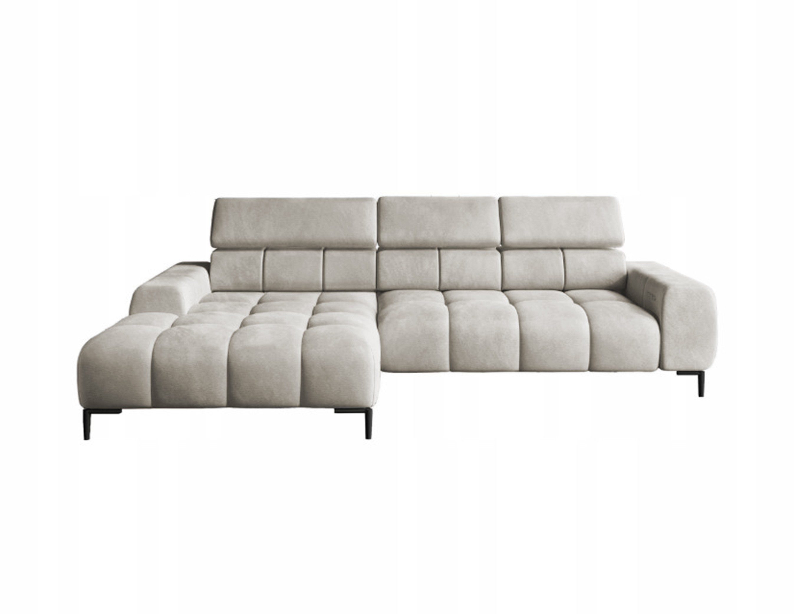 Pikowane siedzisko nadaje narożnikowi nowoczesnego charakteru, a wysokie metalowe nóżki (czarne lub złote) w stylu loftowym dodają mu lekkości i elegancji.