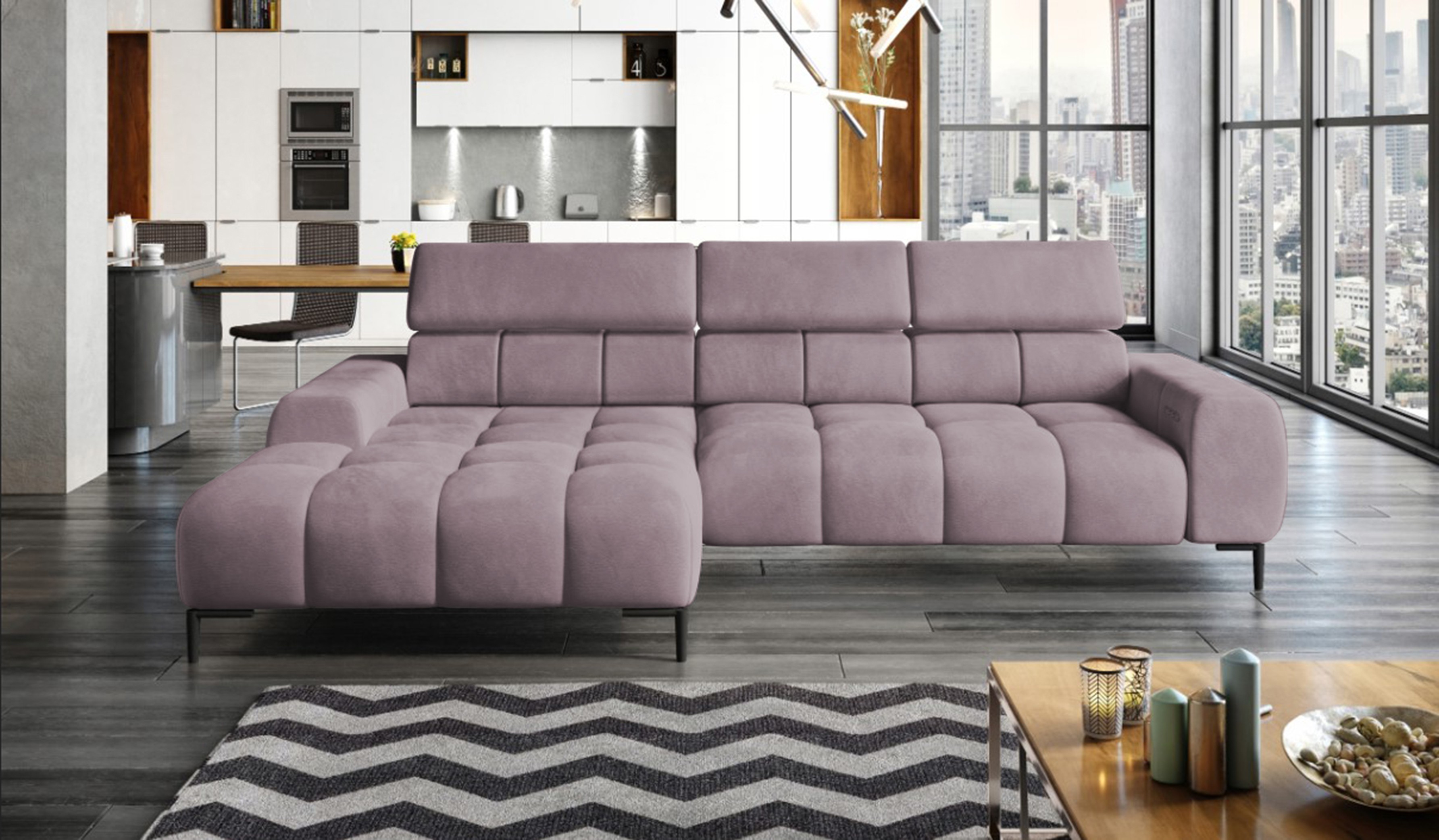 Pikowane siedzisko nadaje narożnikowi nowoczesnego charakteru, a wysokie metalowe nóżki (czarne lub złote) w stylu loftowym dodają mu lekkości i elegancji.