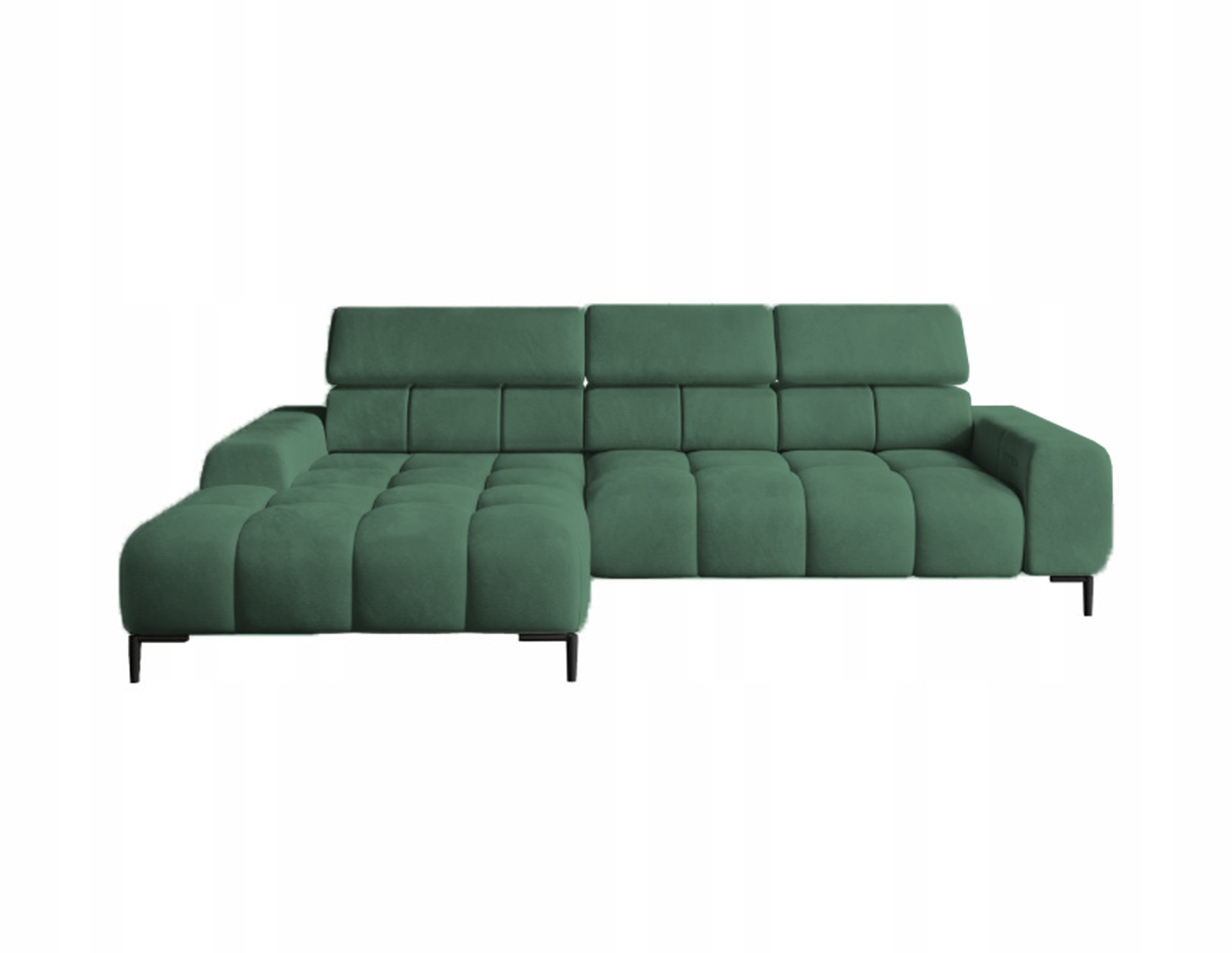 Pikowane siedzisko nadaje narożnikowi nowoczesnego charakteru, a wysokie metalowe nóżki (czarne lub złote) w stylu loftowym dodają mu lekkości i elegancji.