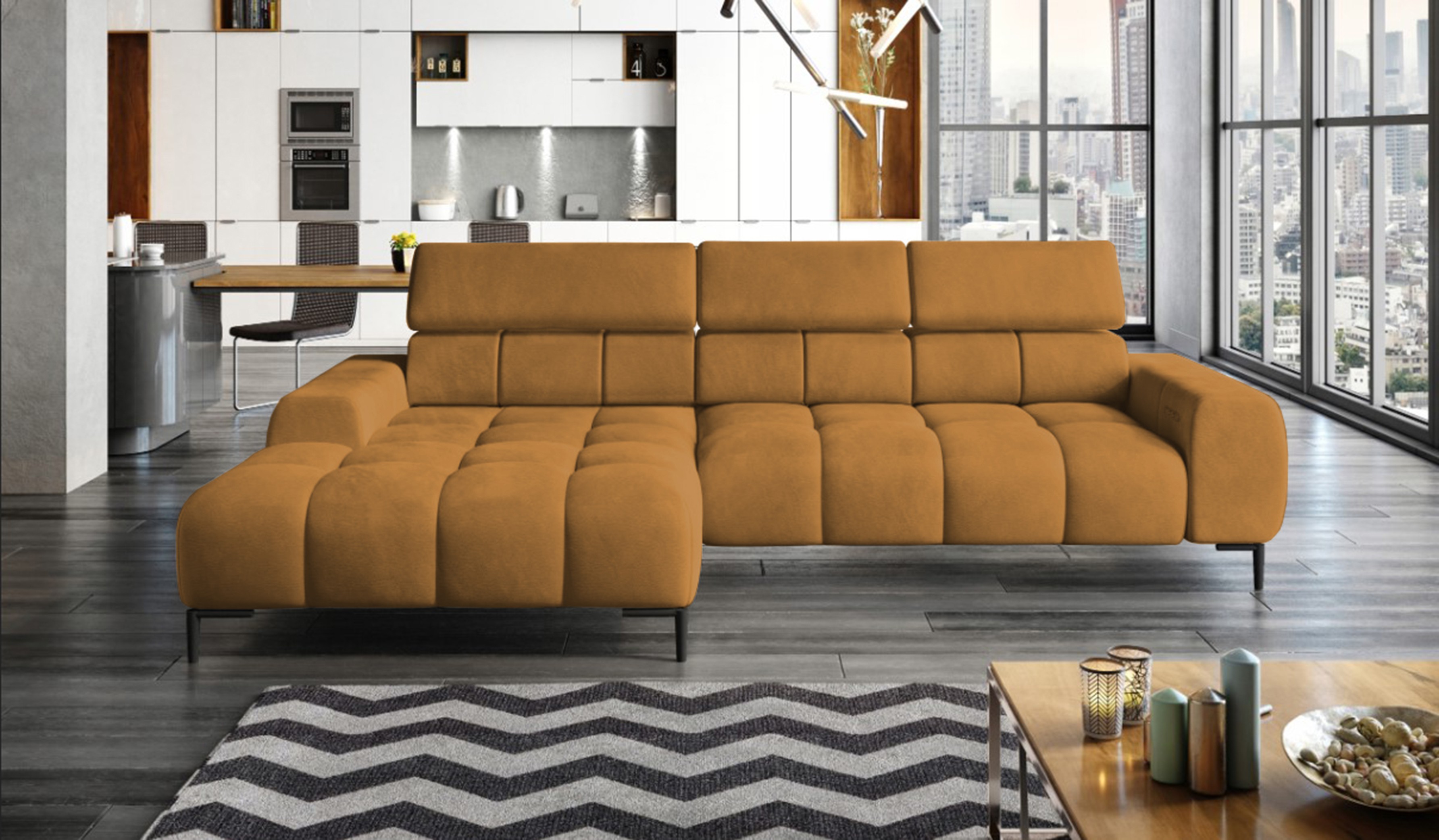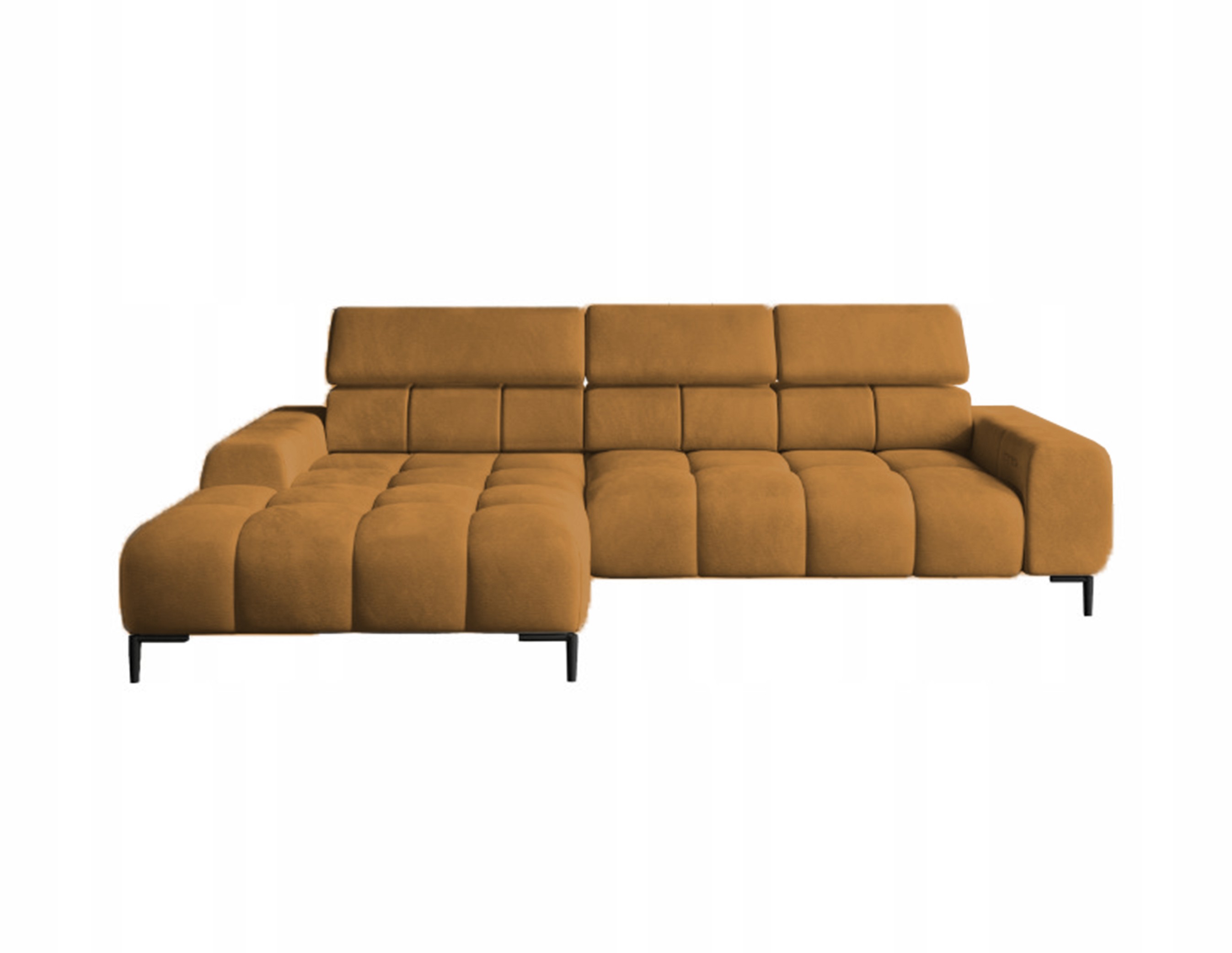 Pikowane siedzisko nadaje narożnikowi nowoczesnego charakteru, a wysokie metalowe nóżki (czarne lub złote) w stylu loftowym dodają mu lekkości i elegancji.