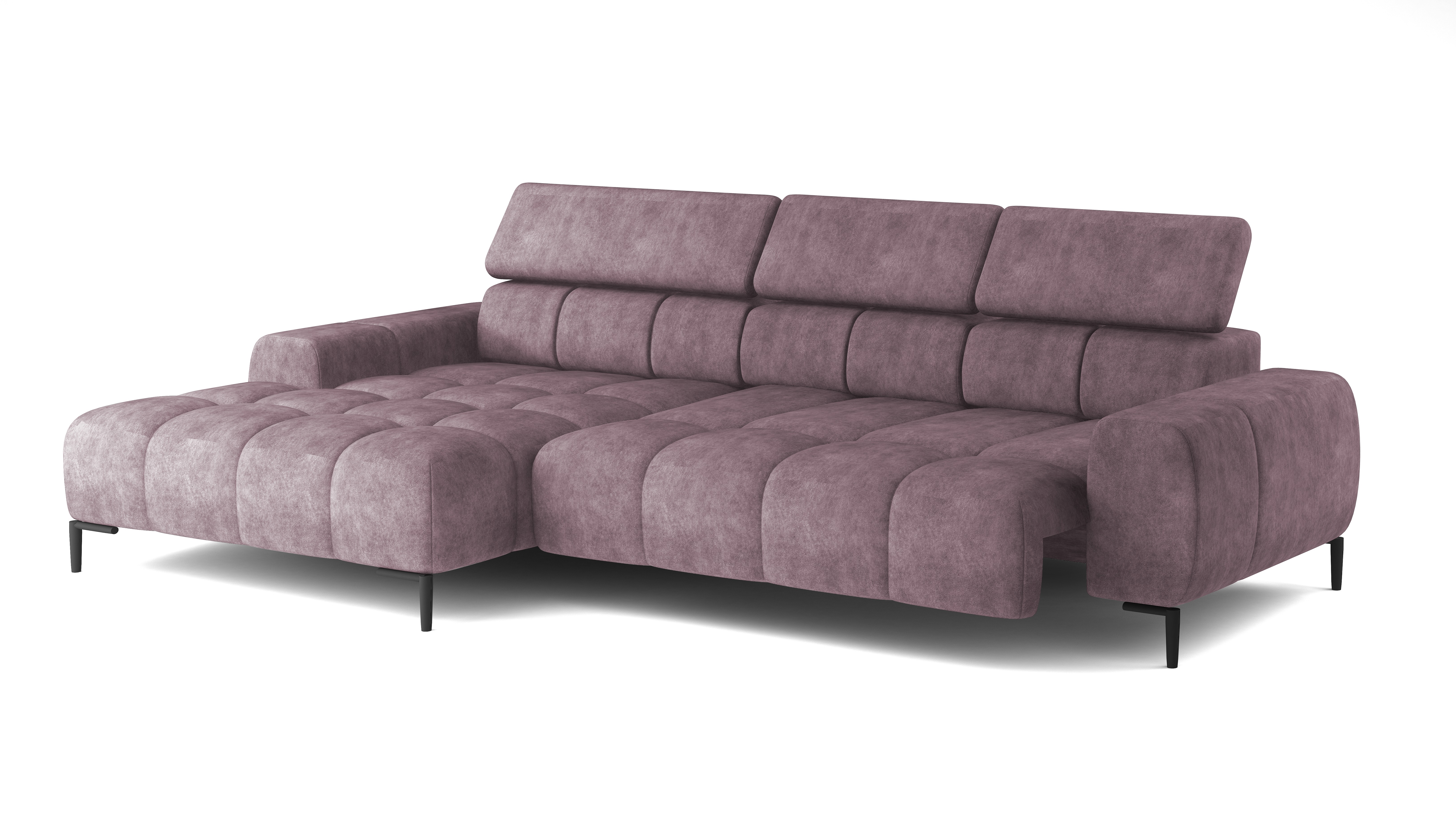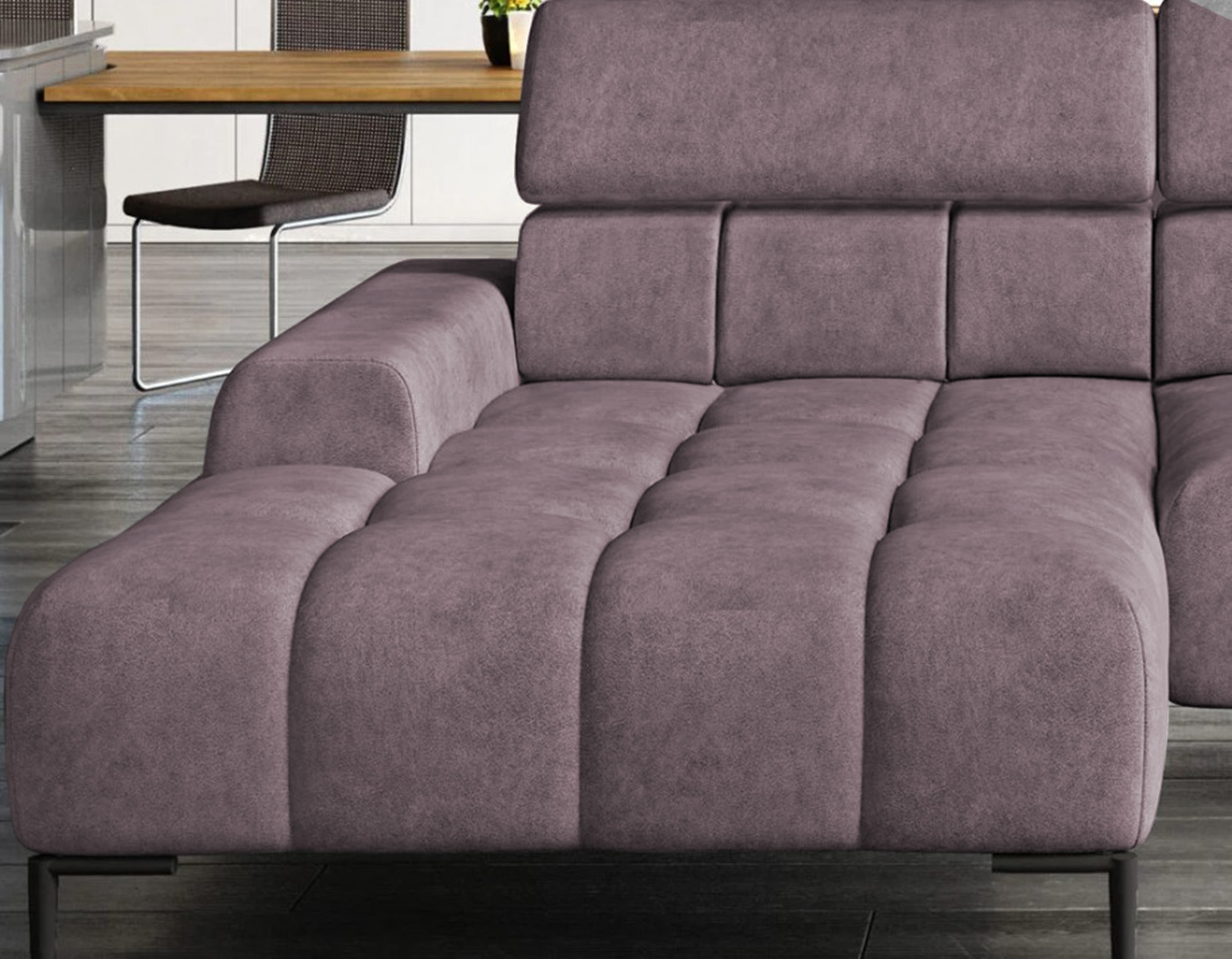 Pikowane siedzisko nadaje narożnikowi nowoczesnego charakteru, a wysokie metalowe nóżki (czarne lub złote) w stylu loftowym dodają mu lekkości i elegancji.