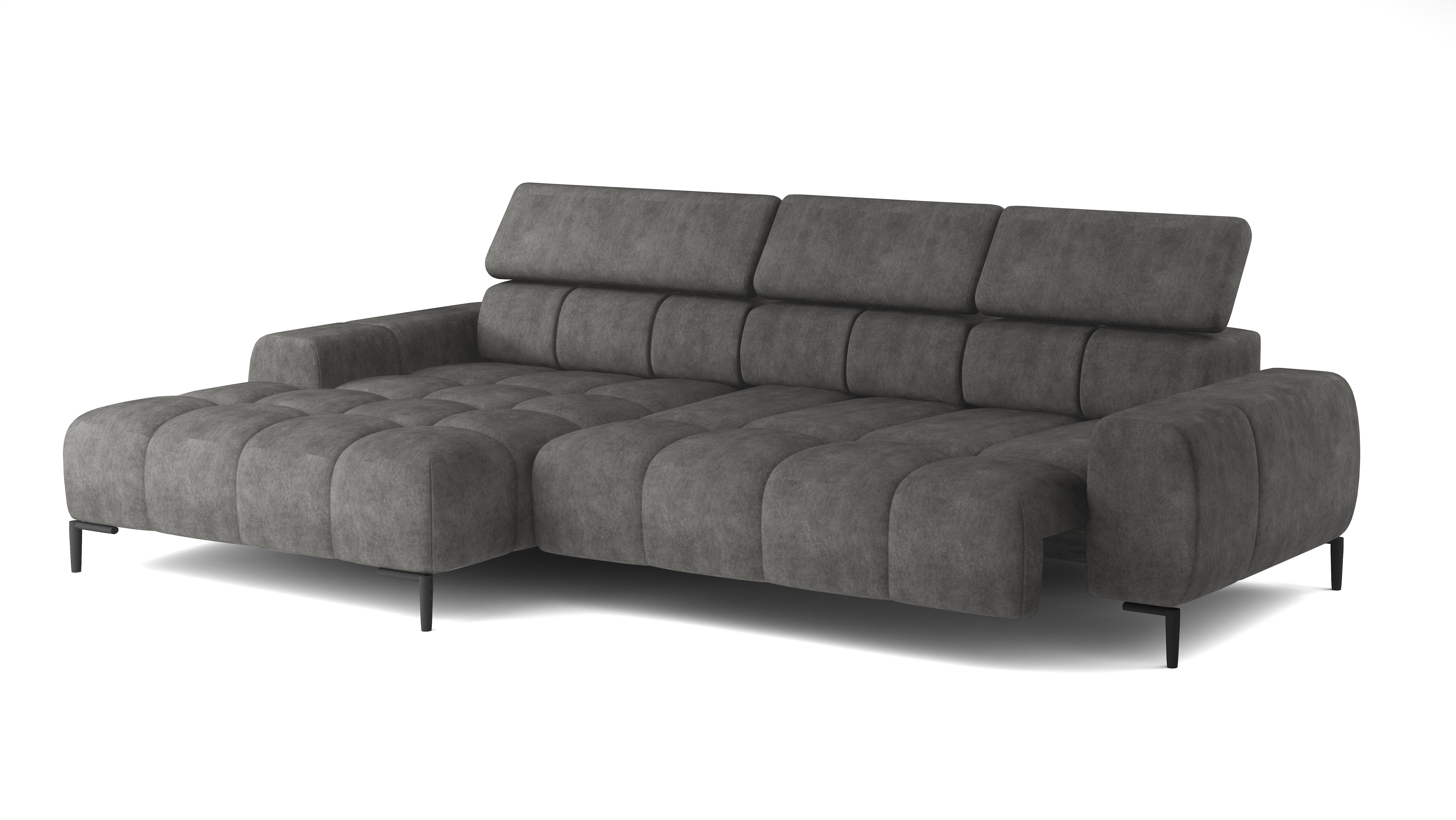 Pikowane siedzisko nadaje narożnikowi nowoczesnego charakteru, a wysokie metalowe nóżki (czarne lub złote) w stylu loftowym dodają mu lekkości i elegancji.