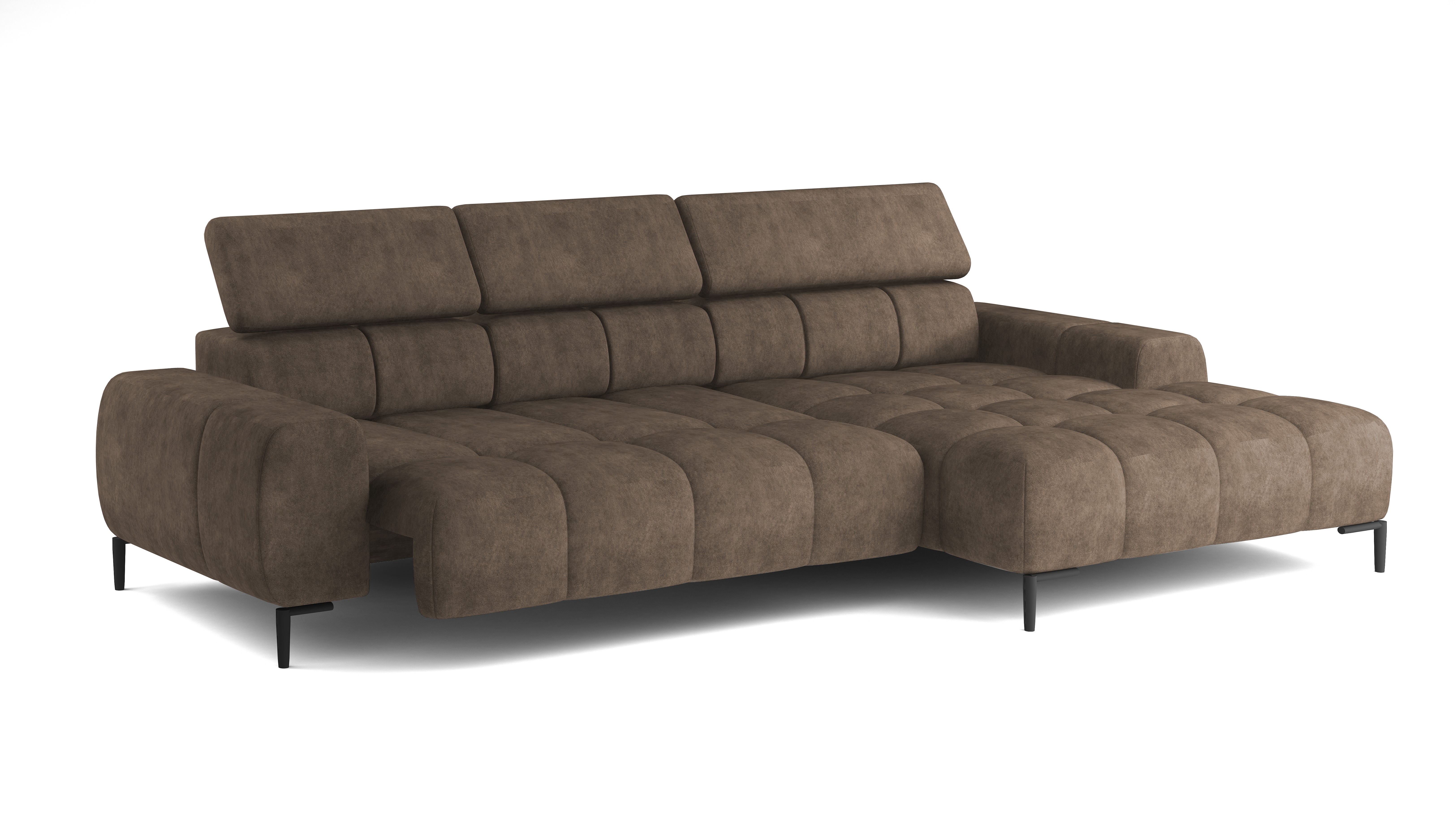 Pikowane siedzisko nadaje narożnikowi nowoczesnego charakteru, a wysokie metalowe nóżki (czarne lub złote) w stylu loftowym dodają mu lekkości i elegancji.