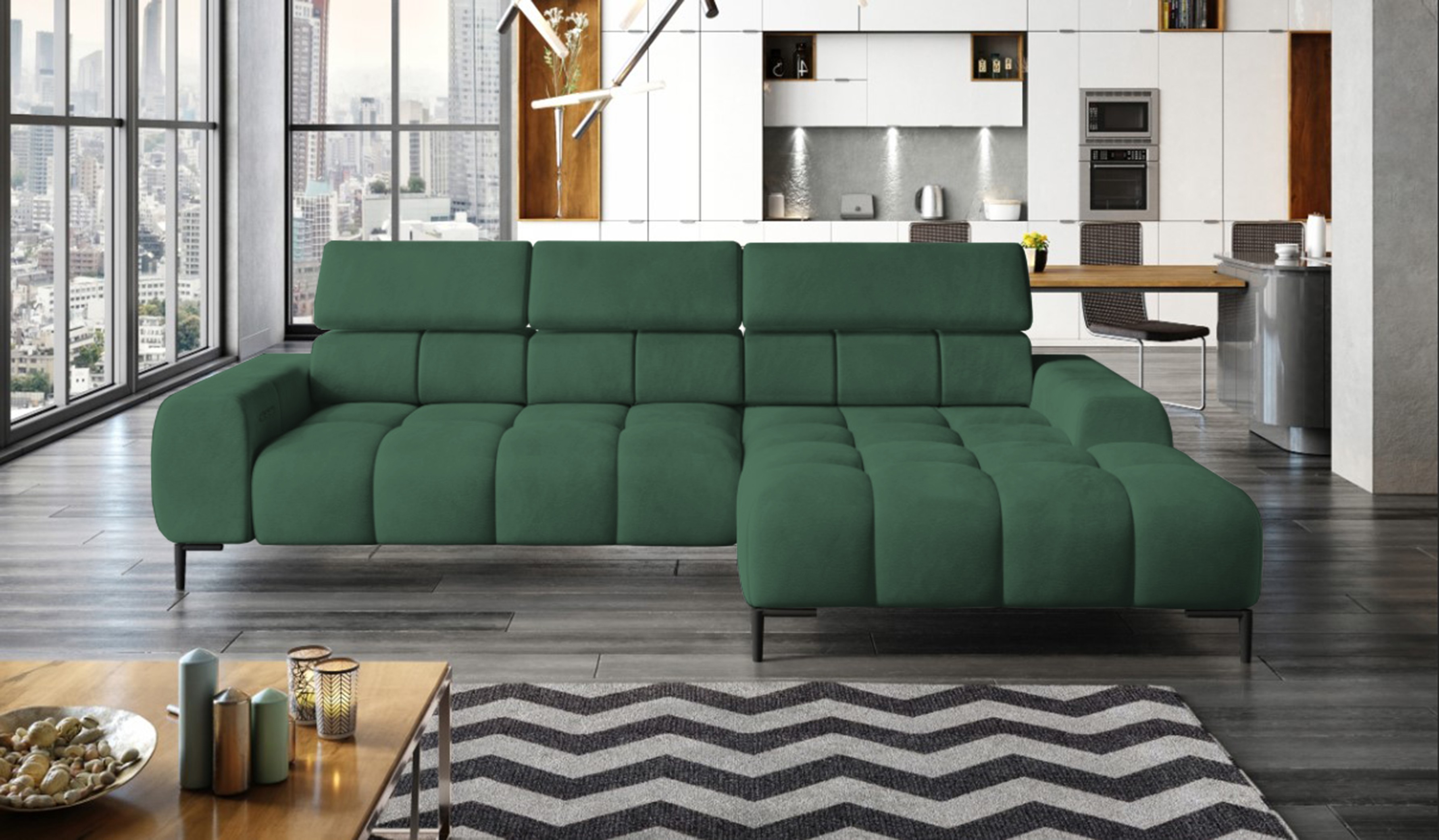 Pikowane siedzisko nadaje narożnikowi nowoczesnego charakteru, a wysokie metalowe nóżki (czarne lub złote) w stylu loftowym dodają mu lekkości i elegancji.