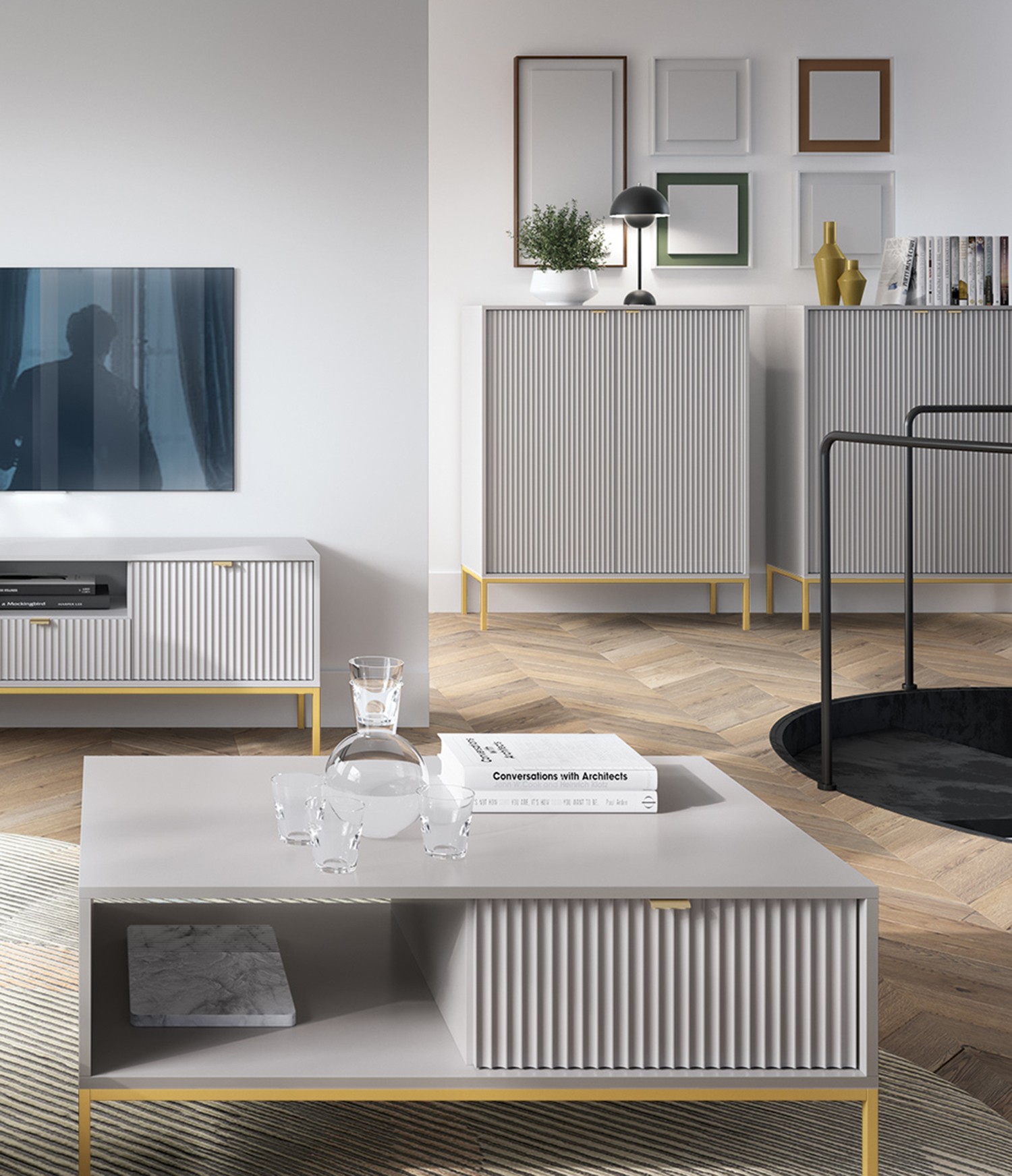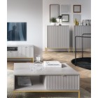• Materiał: płyta laminowana 16 mm, MDF (front ryflowany), obrzeża ABS