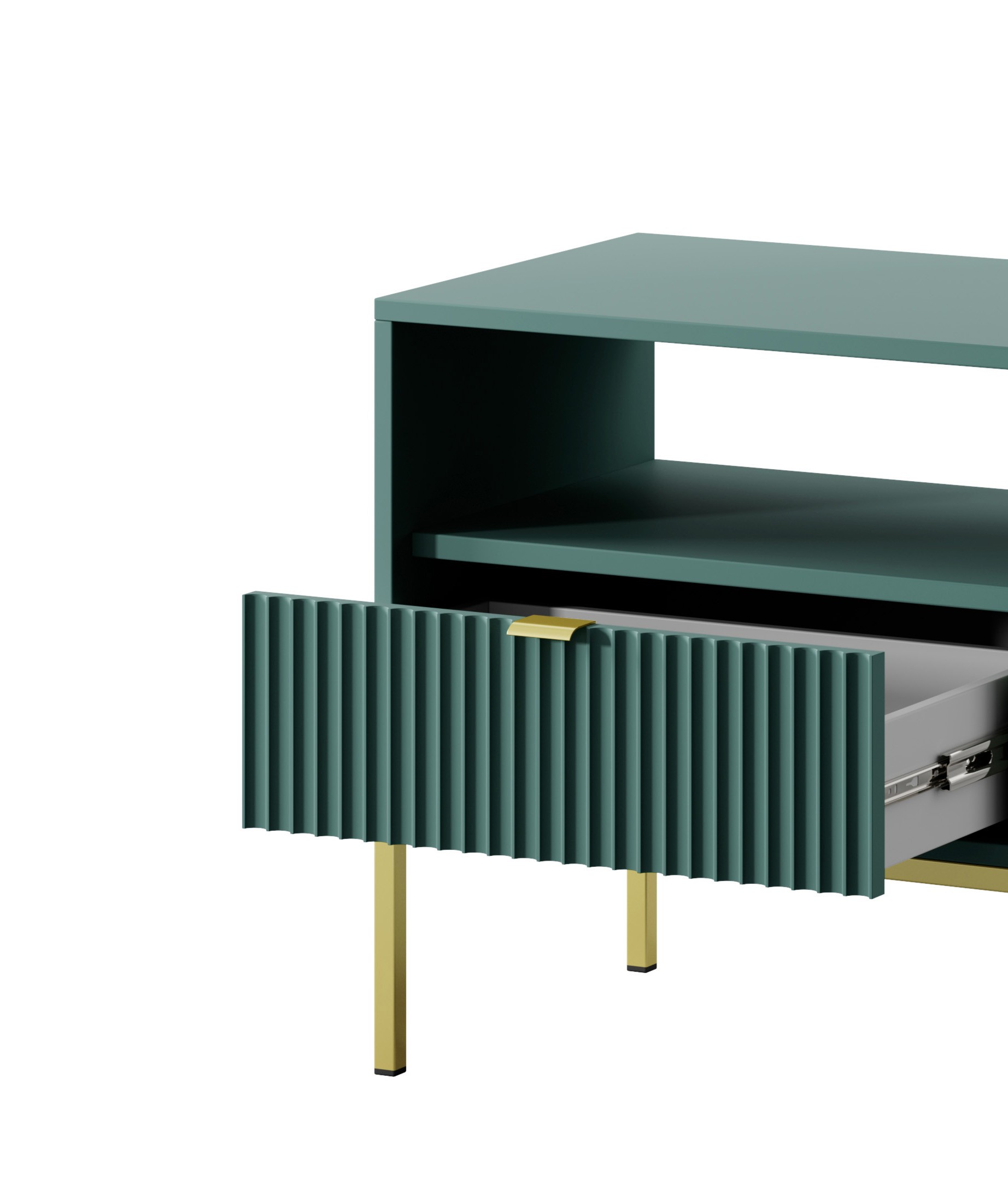 Szafka nocna NAYA to eleganckie i funkcjonalne uzupełnienie każdej sypialni. Nowoczesna matowa struktura w połączeniu ze złotym uchwytem tworzy stylowy, luksusowy efekt, a ryflowany front z płyty MDF nadaje meblowi wyjątkowej głębi i charakteru.