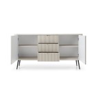 Szeroka komoda z kolekcji ZURI to połączenie klasycznej elegancji z nowoczesnym designem. Zaokrąglone boki oraz dekoracyjne ryflowania na froncie i korpusie wyróżniają mebel na tle innych propozycji i przyciągają uwagę miłośników estetycznych wnętrz. Smukłe, drewniane nogi nadają bryle lekkości oraz ułatwiają utrzymanie czystości pod meblem.