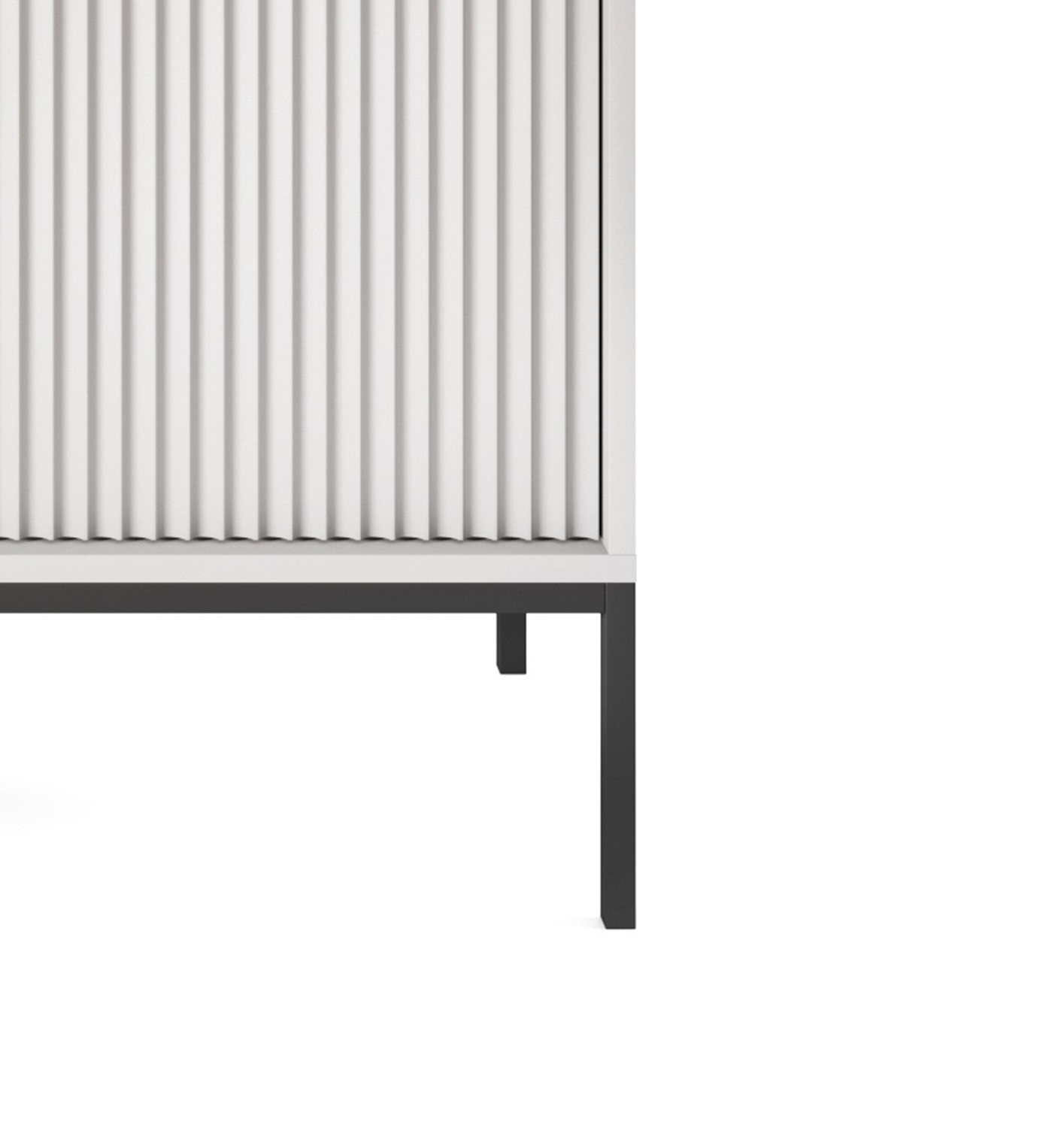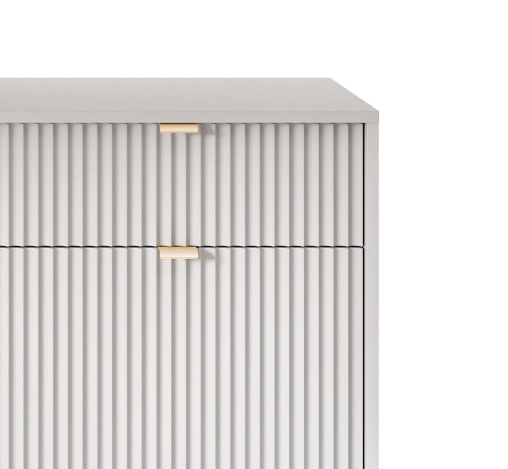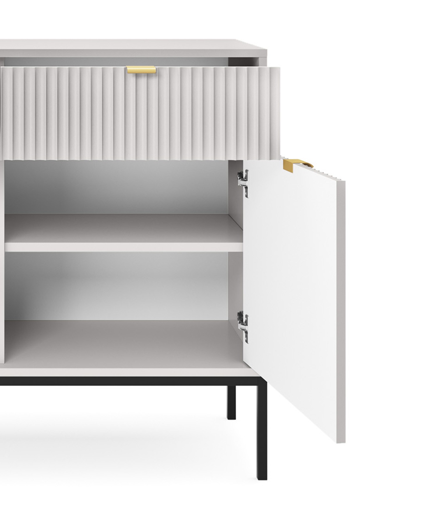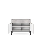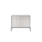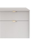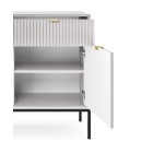 Komoda NAYA to doskonały wybór do nowoczesnego salonu, gabinetu lub przedpokoju. Stylowa, ryflowana powierzchnia frontowa w połączeniu ze złotymi detalami nadaje wnętrzu elegancji i subtelnego charakteru glamour, podkreślając wyjątkowy design mebla.
