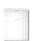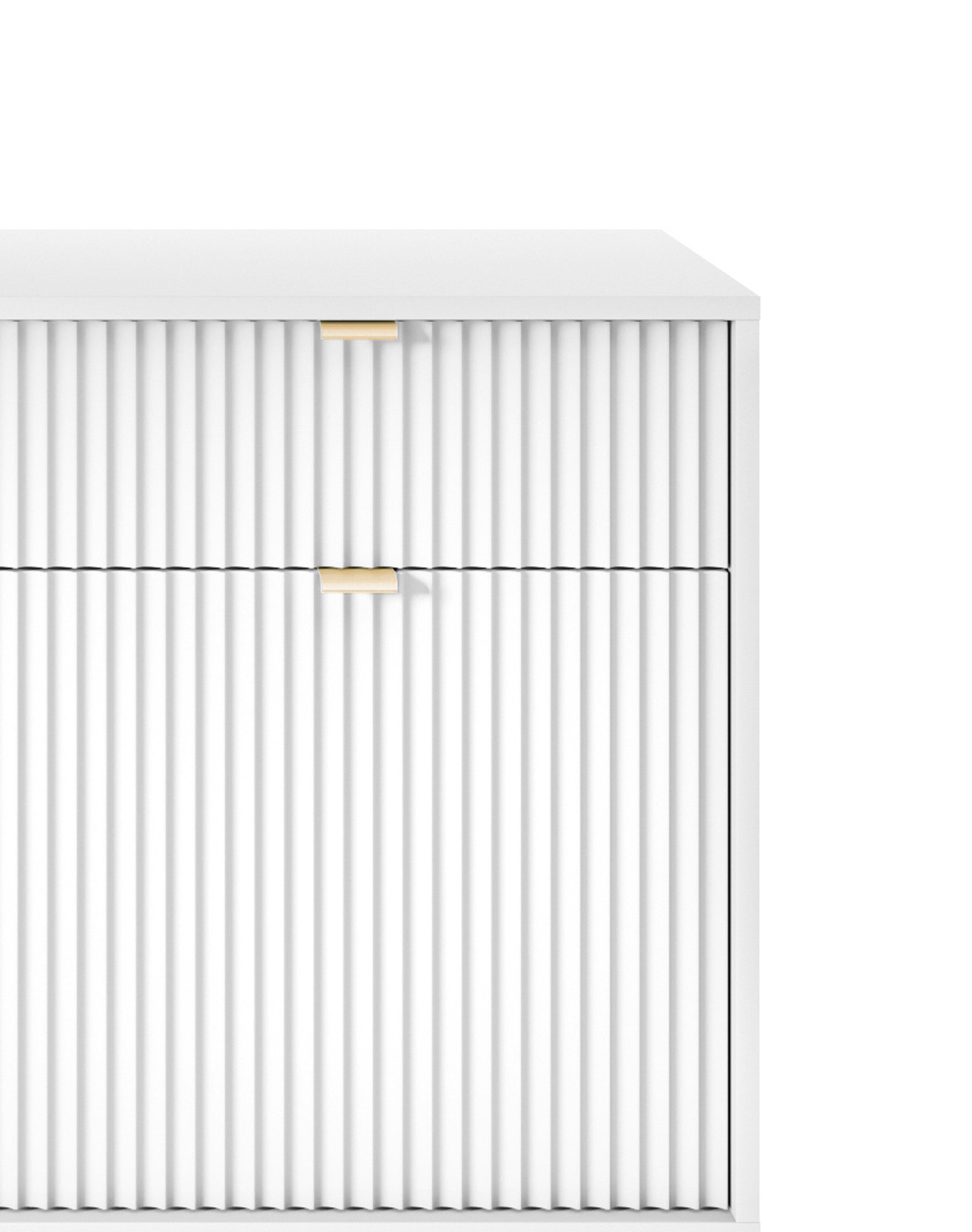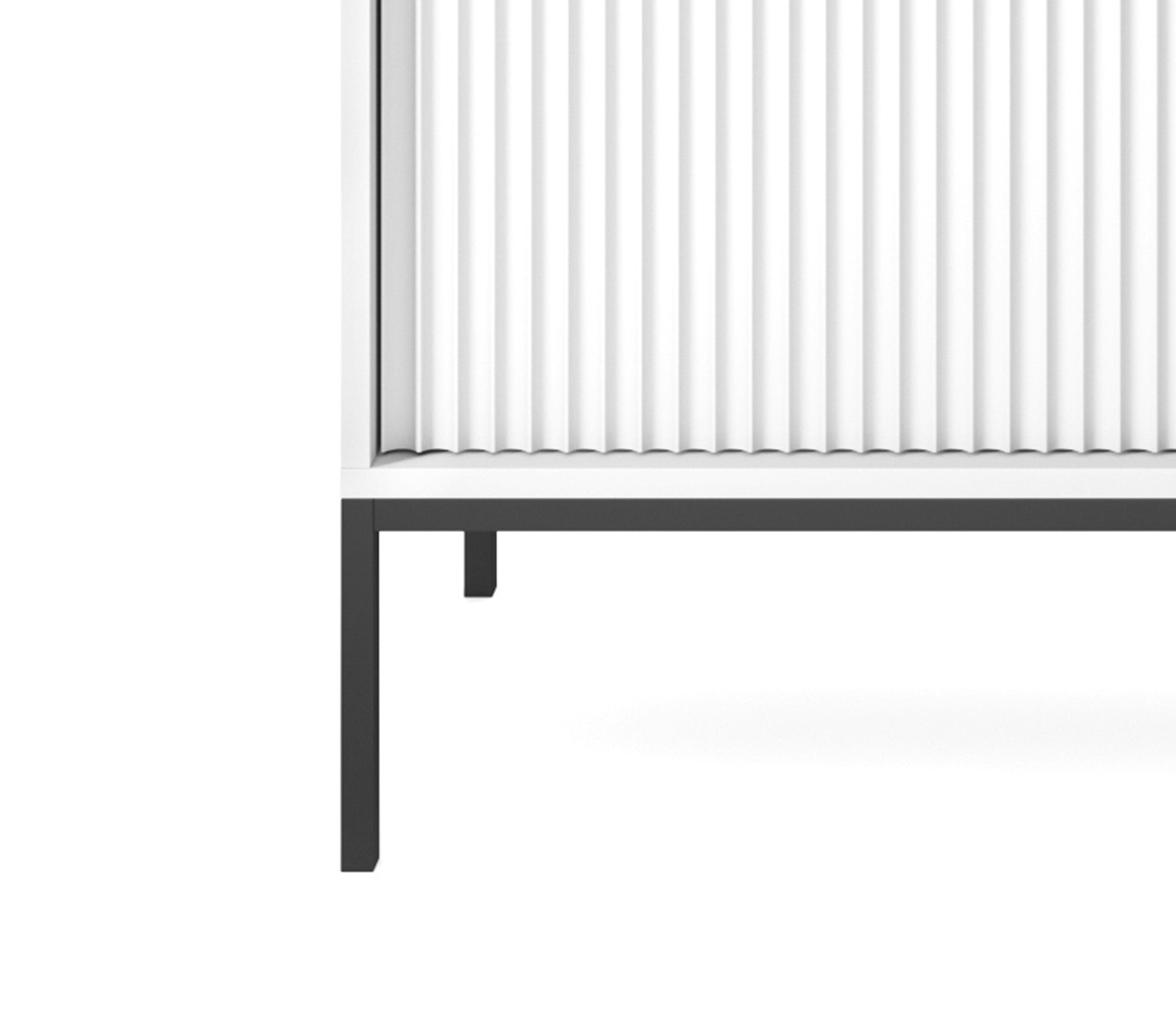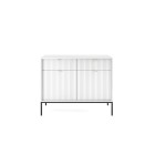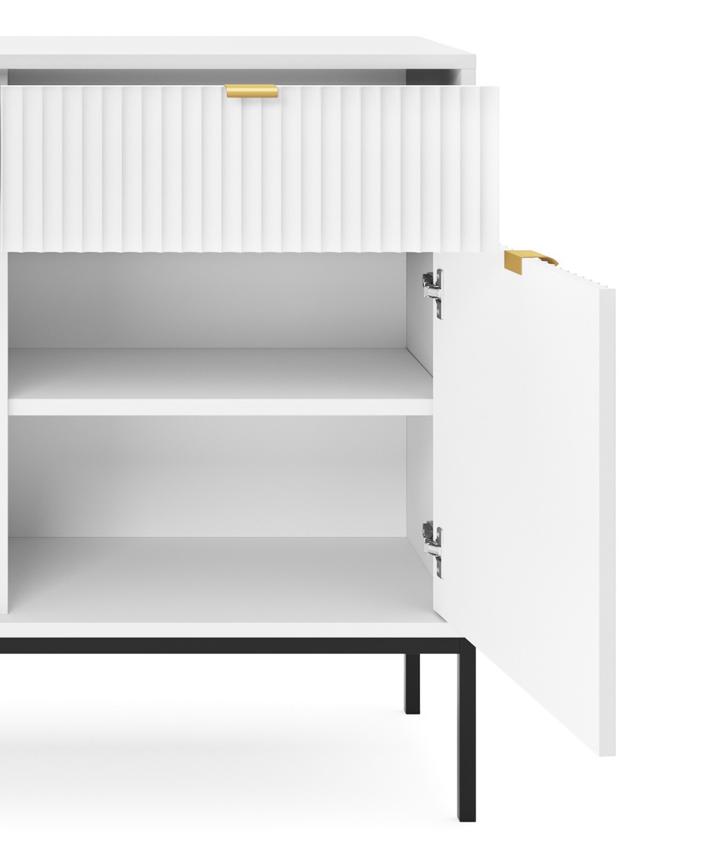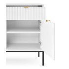 Komoda NAYA to doskonały wybór do nowoczesnego salonu, gabinetu lub przedpokoju. Stylowa, ryflowana powierzchnia frontowa w połączeniu ze złotymi detalami nadaje wnętrzu elegancji i subtelnego charakteru glamour, podkreślając wyjątkowy design mebla.