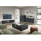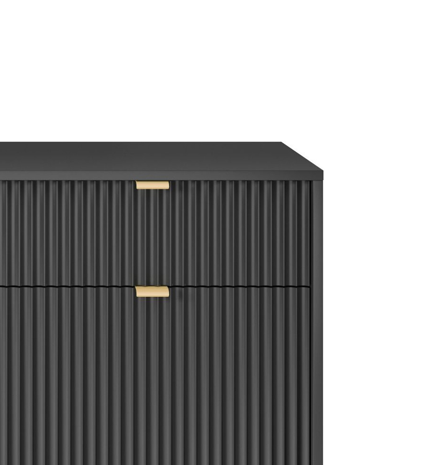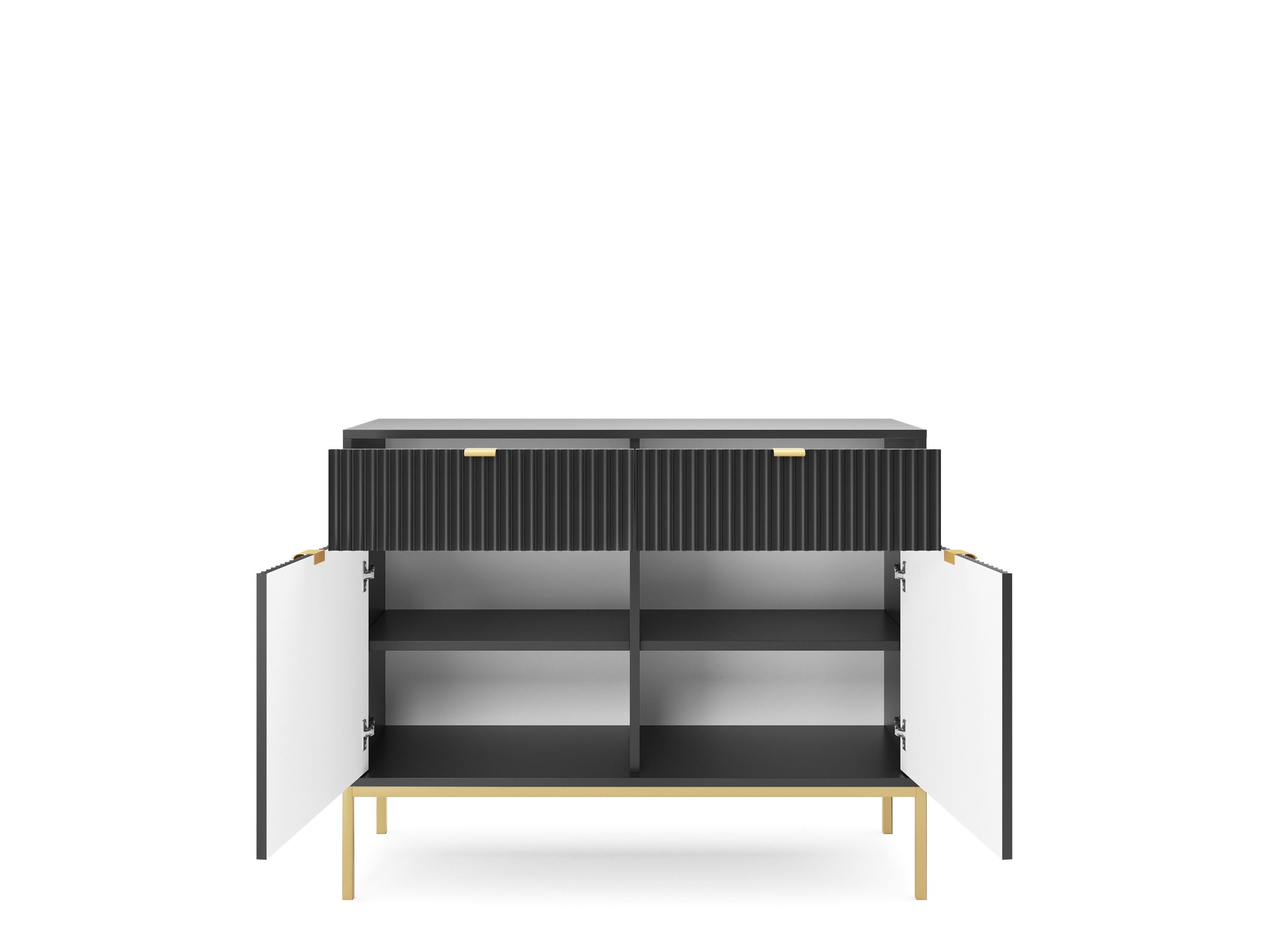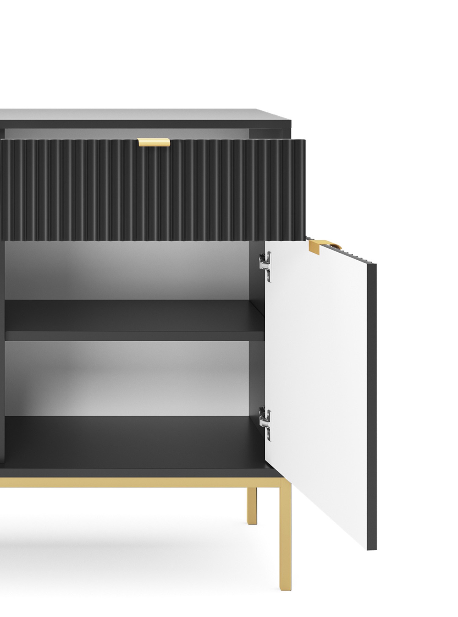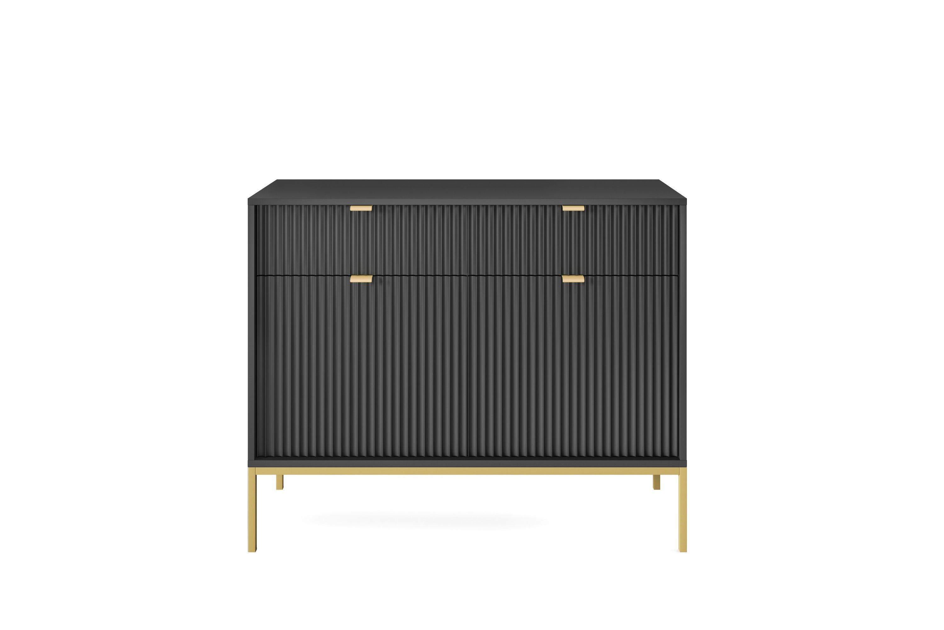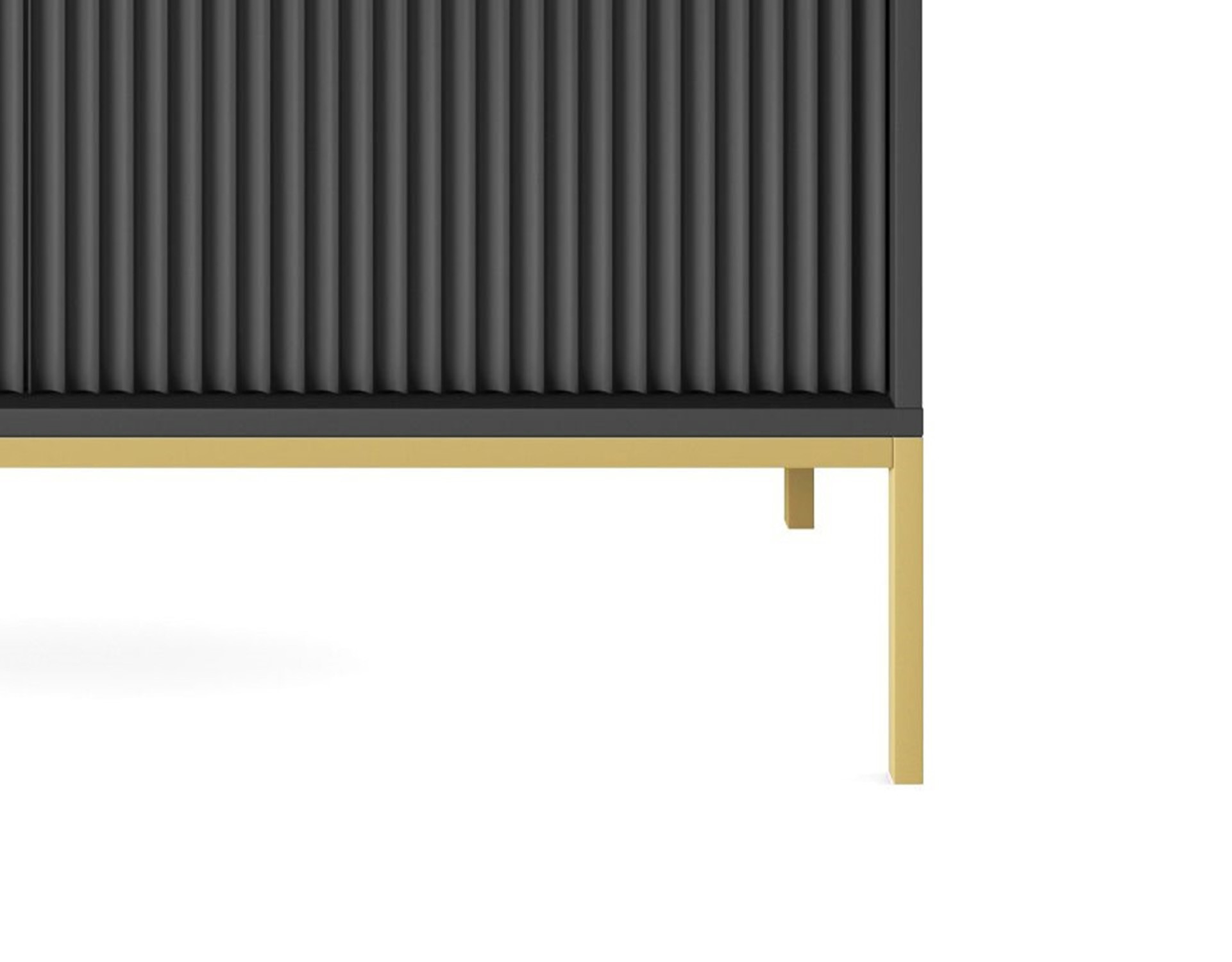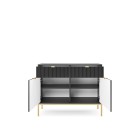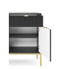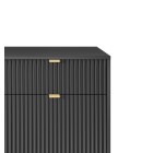 Komoda NAYA to doskonały wybór do nowoczesnego salonu, gabinetu lub przedpokoju. Stylowa, ryflowana powierzchnia frontowa w połączeniu ze złotymi detalami nadaje wnętrzu elegancji i subtelnego charakteru glamour, podkreślając wyjątkowy design mebla.
