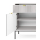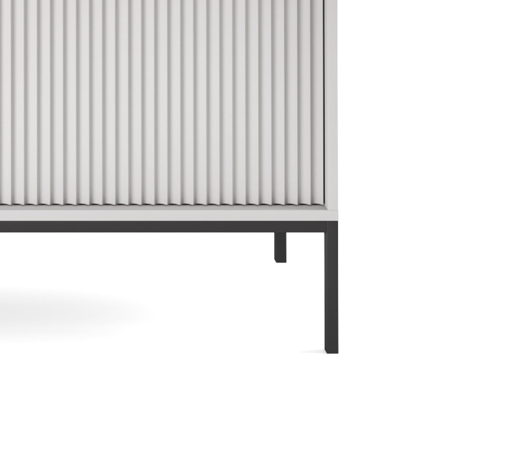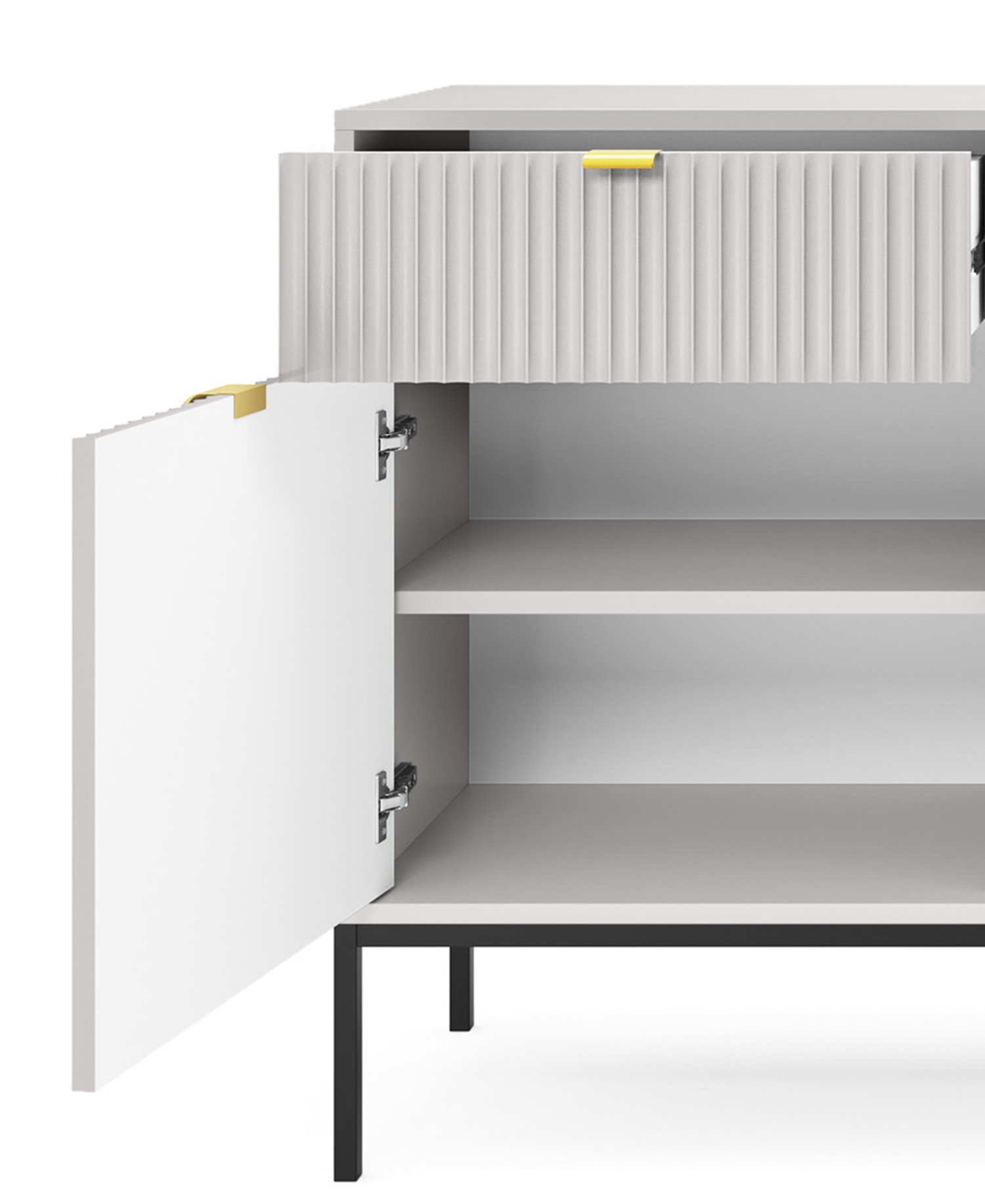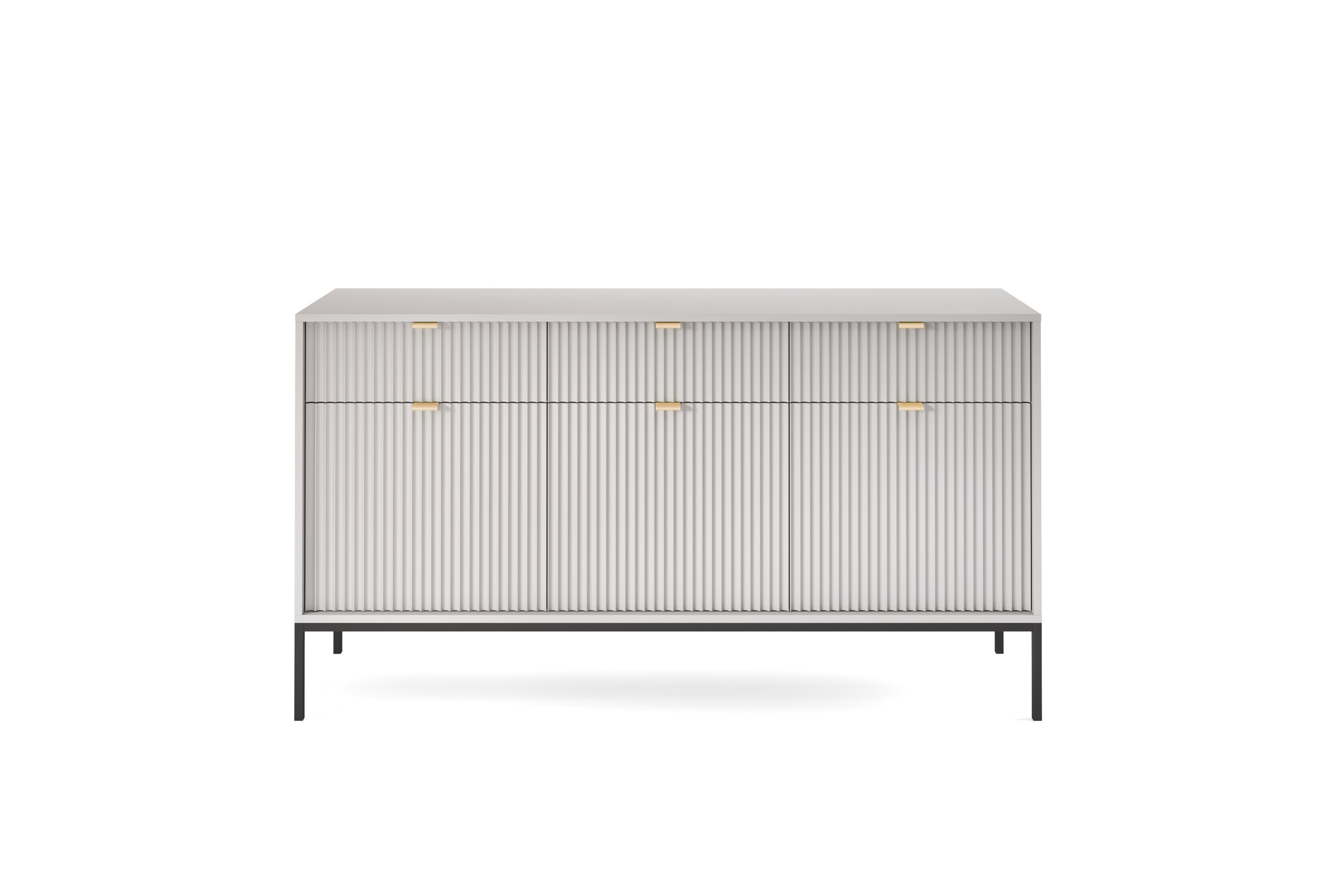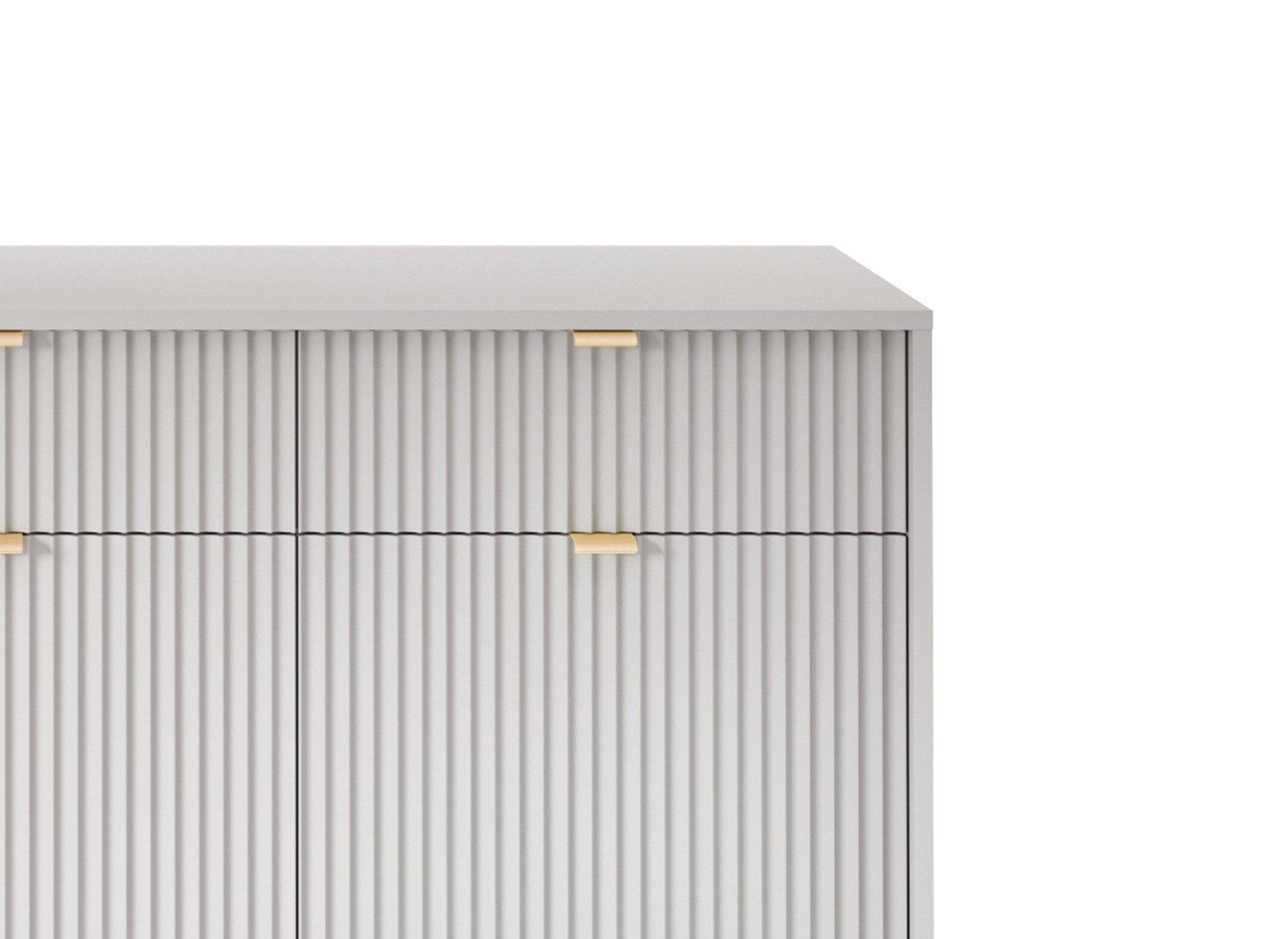 Duża ryflowana komoda NAYA to idealne połączenie nowoczesnego designu, funkcjonalności oraz luksusowych detali. Elegancka matowa struktura w zestawieniu ze złotymi akcentami sprawia, że mebel staje się wyrazistą ozdobą salonu, przedpokoju lub biura. Przemyślany układ wnętrza zapewnia dużo miejsca do przechowywania, a solidne wykonanie gwarantuje trwałość na lata.