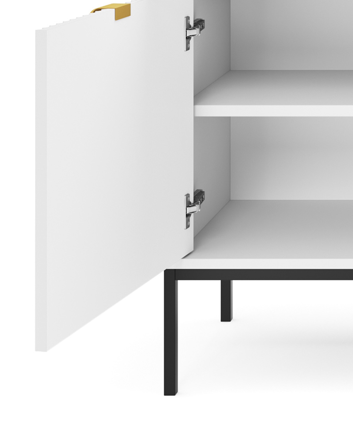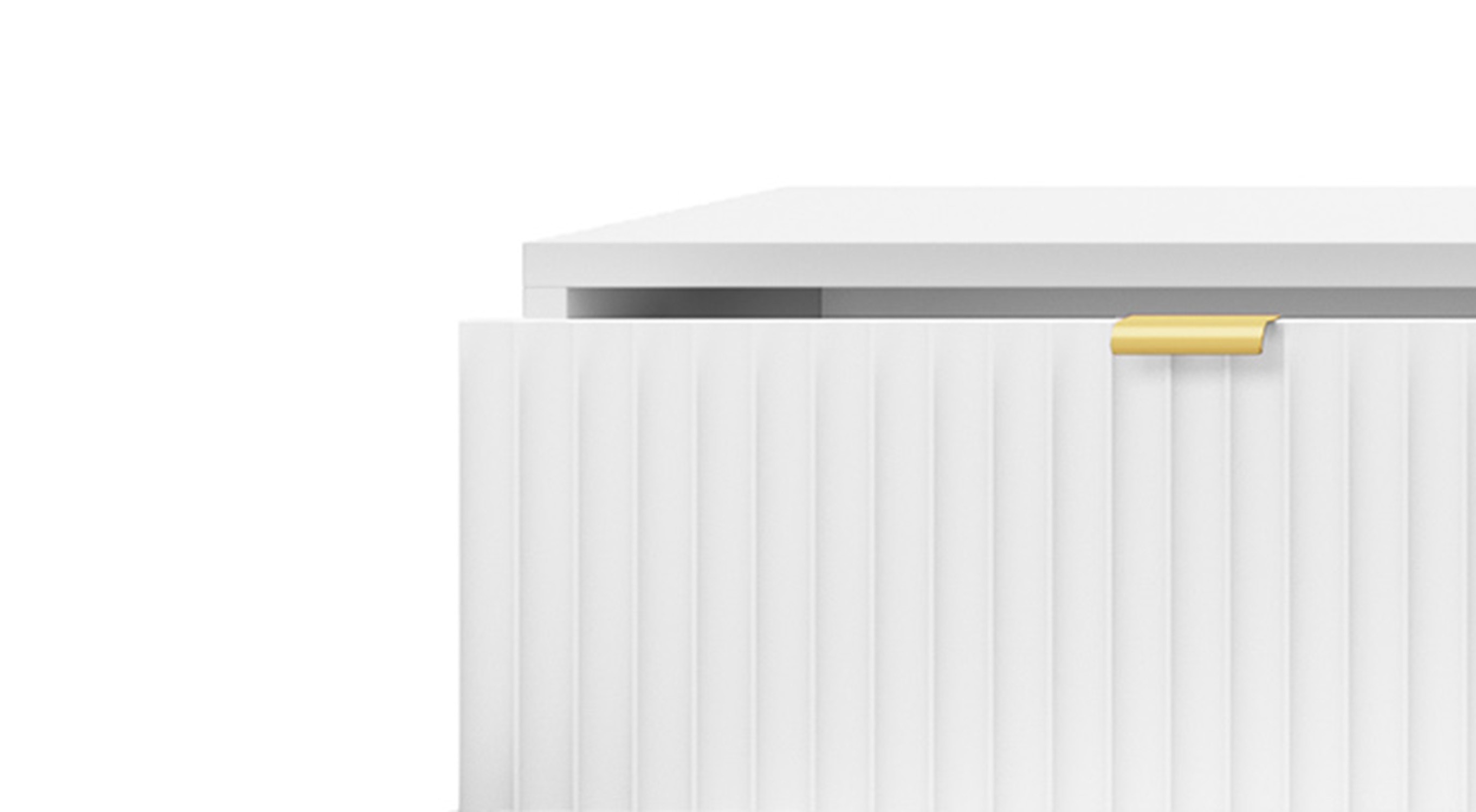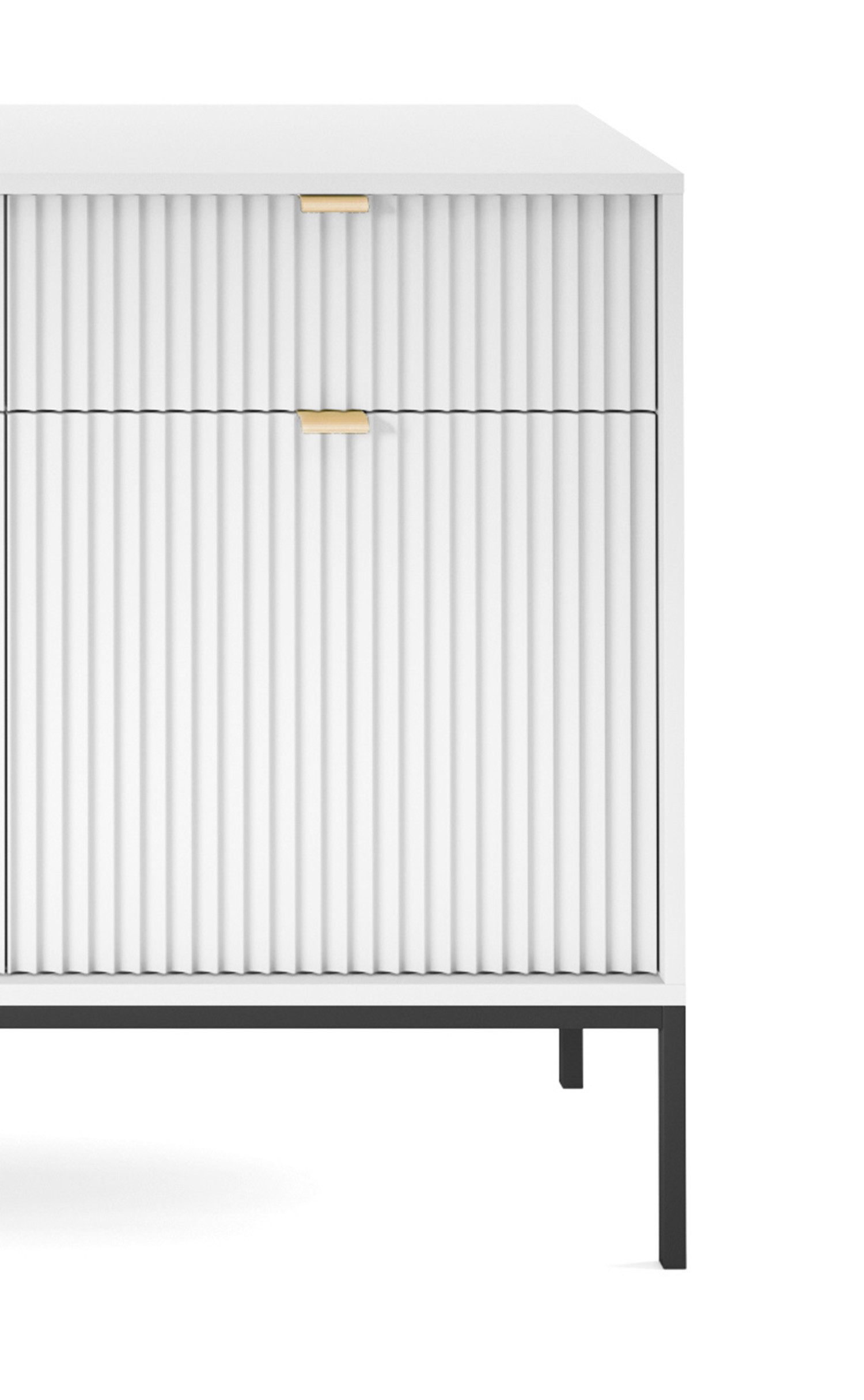 Duża ryflowana komoda NAYA to idealne połączenie nowoczesnego designu, funkcjonalności oraz luksusowych detali. Elegancka matowa struktura w zestawieniu ze złotymi akcentami sprawia, że mebel staje się wyrazistą ozdobą salonu, przedpokoju lub biura. Przemyślany układ wnętrza zapewnia dużo miejsca do przechowywania, a solidne wykonanie gwarantuje trwałość na lata.