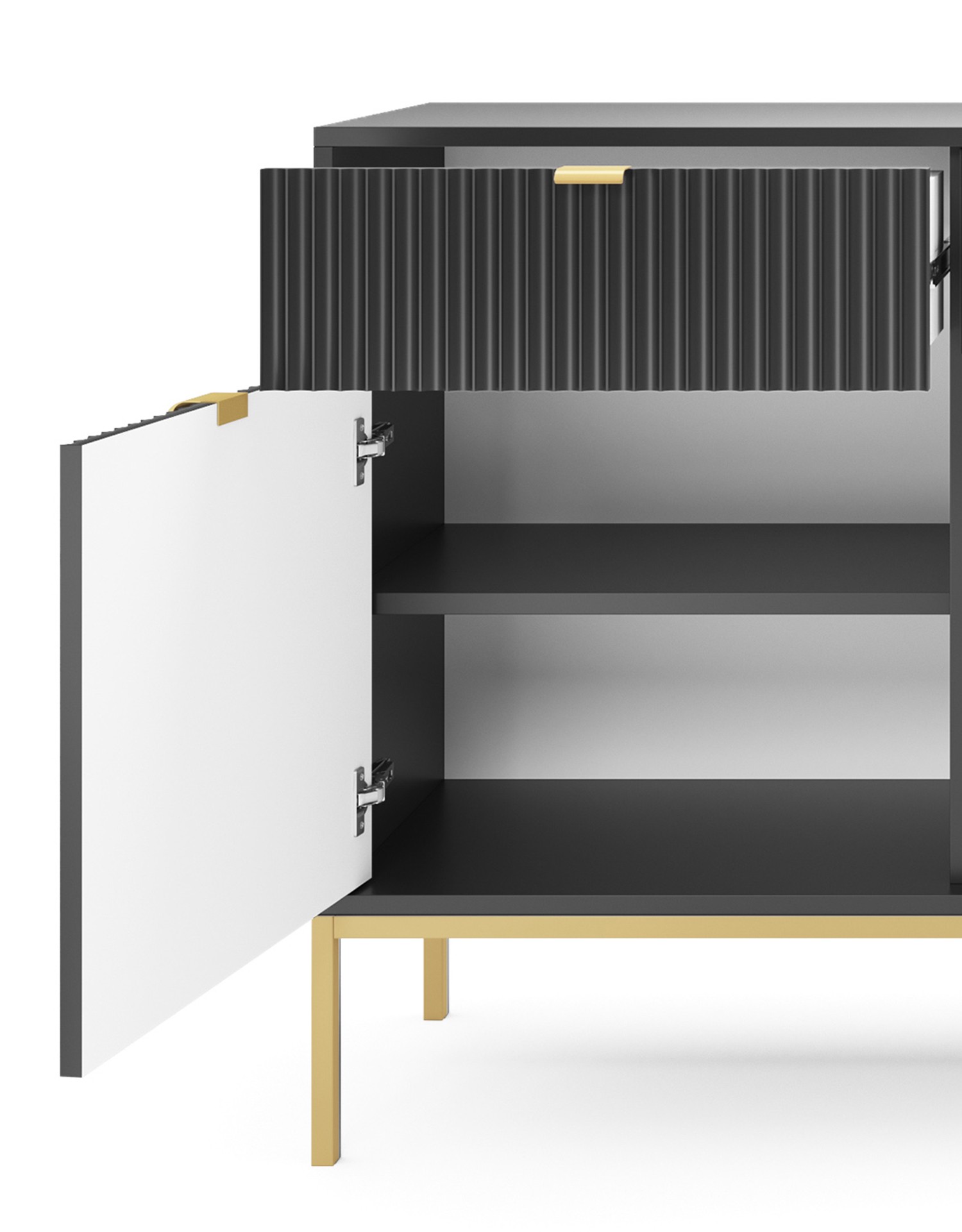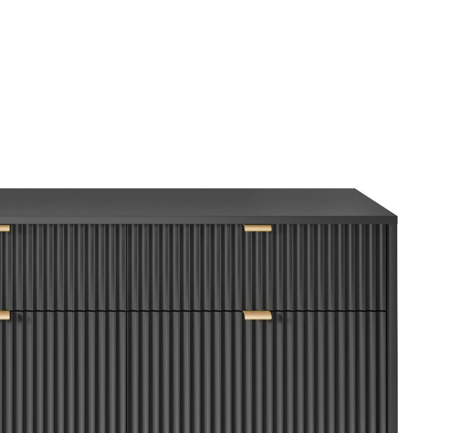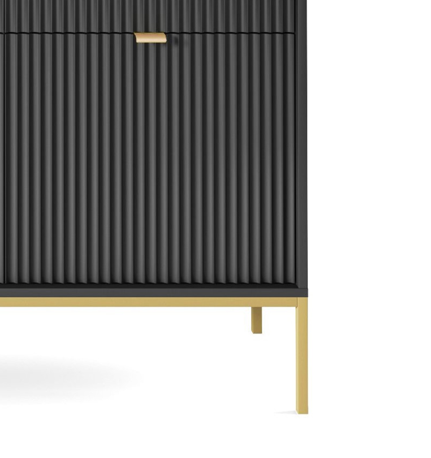 Duża ryflowana komoda NAYA to idealne połączenie nowoczesnego designu, funkcjonalności oraz luksusowych detali. Elegancka matowa struktura w zestawieniu ze złotymi akcentami sprawia, że mebel staje się wyrazistą ozdobą salonu, przedpokoju lub biura. Przemyślany układ wnętrza zapewnia dużo miejsca do przechowywania, a solidne wykonanie gwarantuje trwałość na lata.