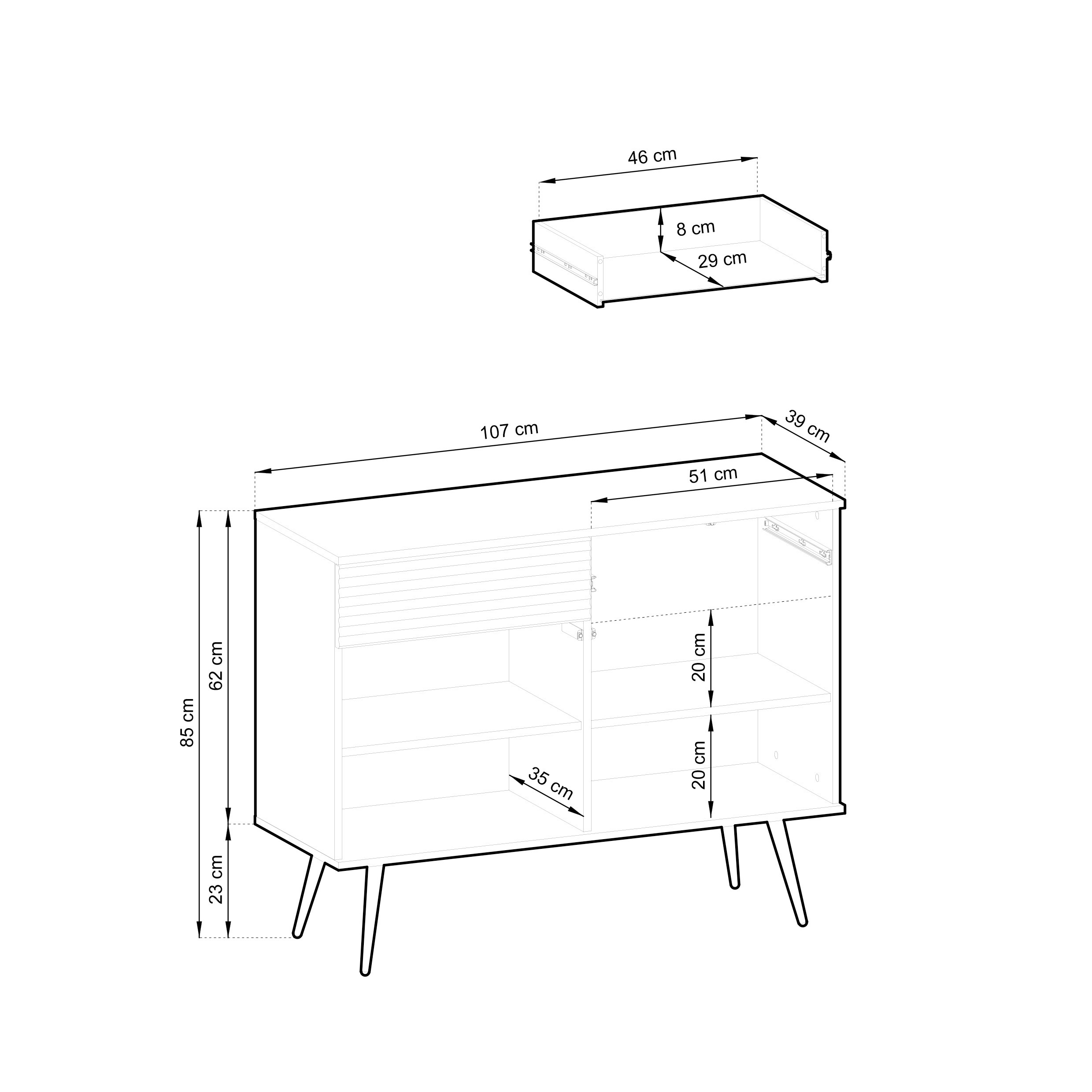 Komoda ORIANA 107 cm to nowoczesny mebel łączący stylowy design z praktyczną funkcjonalnością. Dzięki dopracowanym detalom oraz smukłym metalowym nogom doskonale wpisuje się w aranżacje: