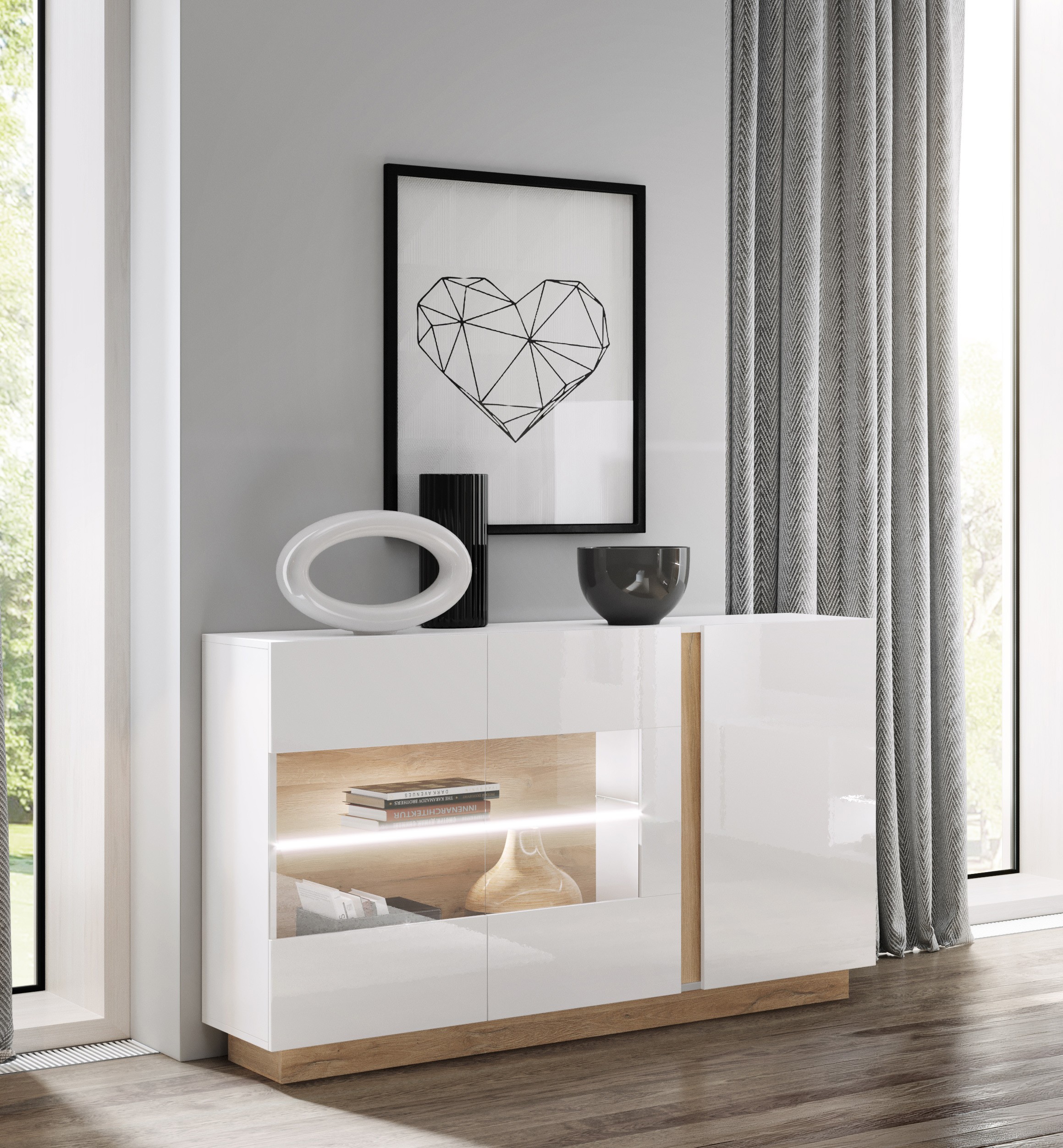 RACO komoda 138 3D to nowoczesny i elegancki mebel, który doskonale sprawdzi się w salonie, jadalni lub przestrzeni dziennej. Łączy w sobie funkcjonalność z designerskim stylem, oferując przestrzeń do przechowywania oraz możliwość efektownej ekspozycji dekoracji.