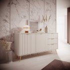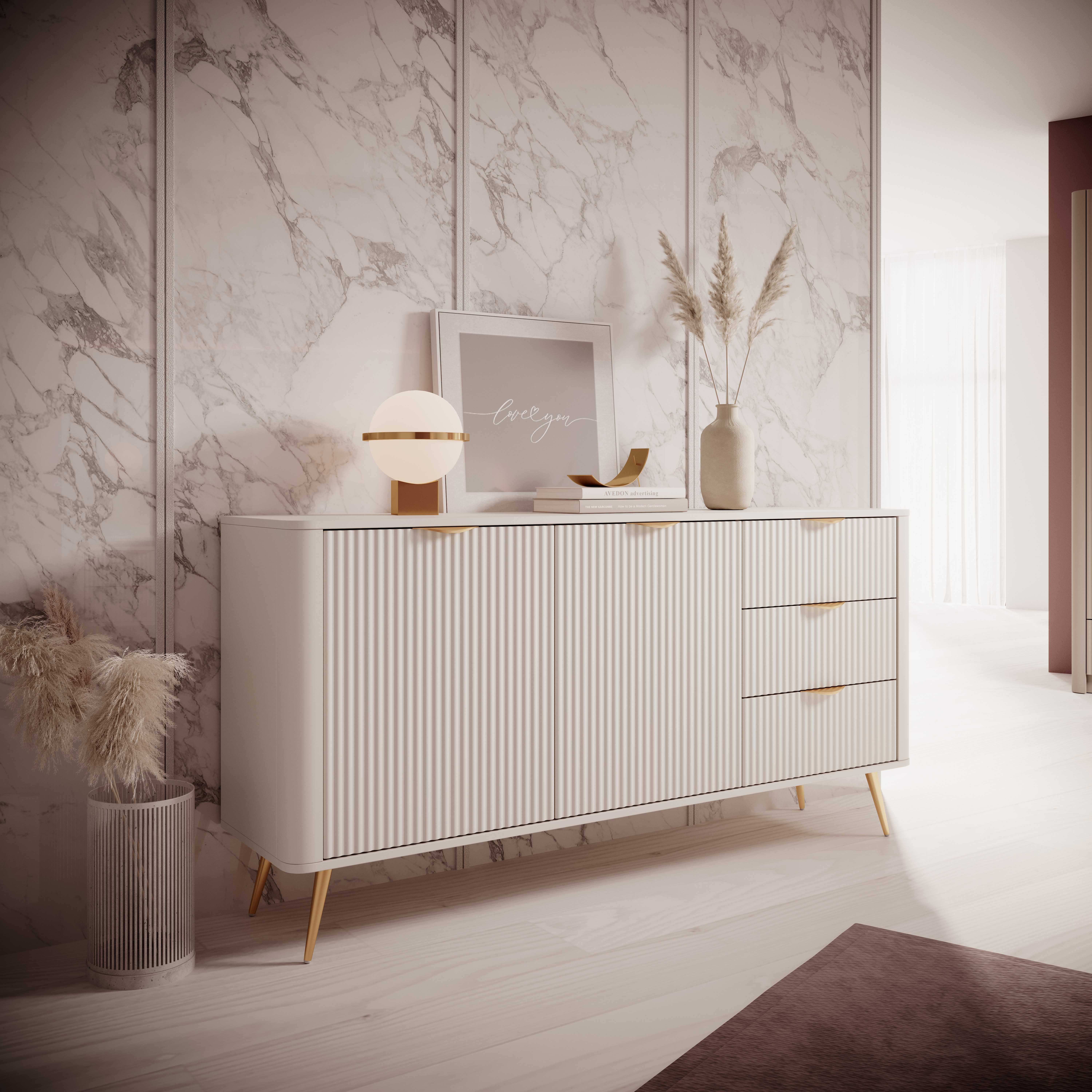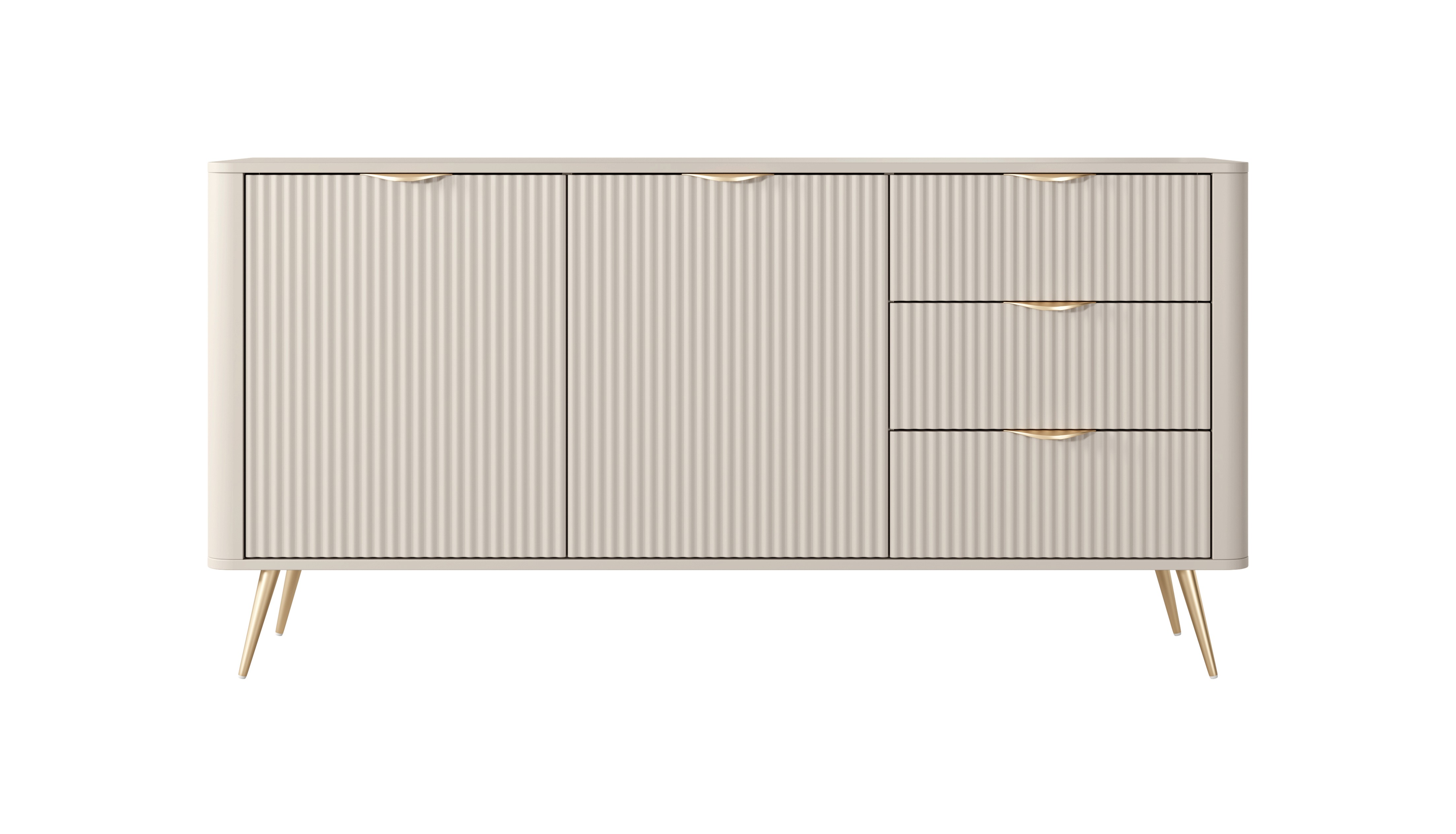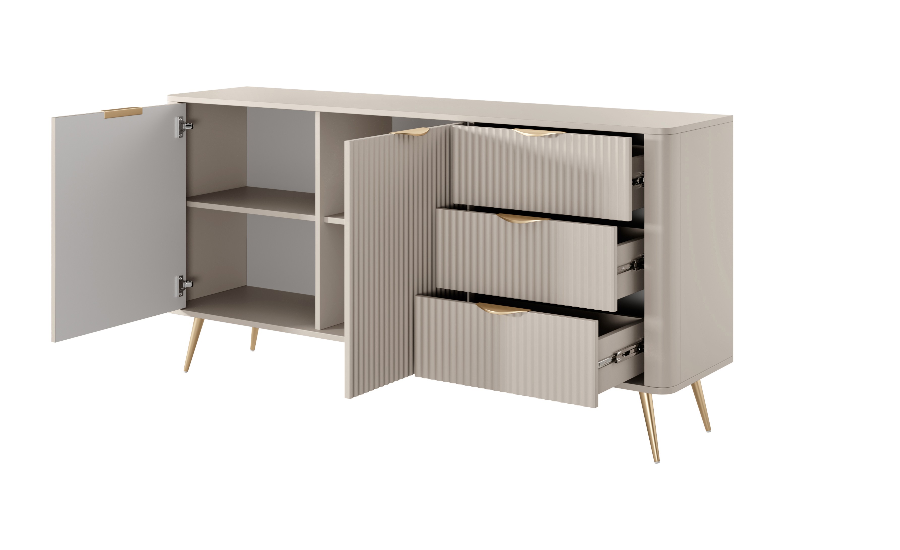 Ryflowane fronty oraz delikatnie zaokrąglone krawędzie podkreślają wysoką jakość wykonania i nadają bryle eleganckiego charakteru. Smukłe, wysokie nóżki nie tylko zapewniają stabilność, ale także wprowadzają lekkość wizualną oraz ułatwiają utrzymanie czystości pod meblem.