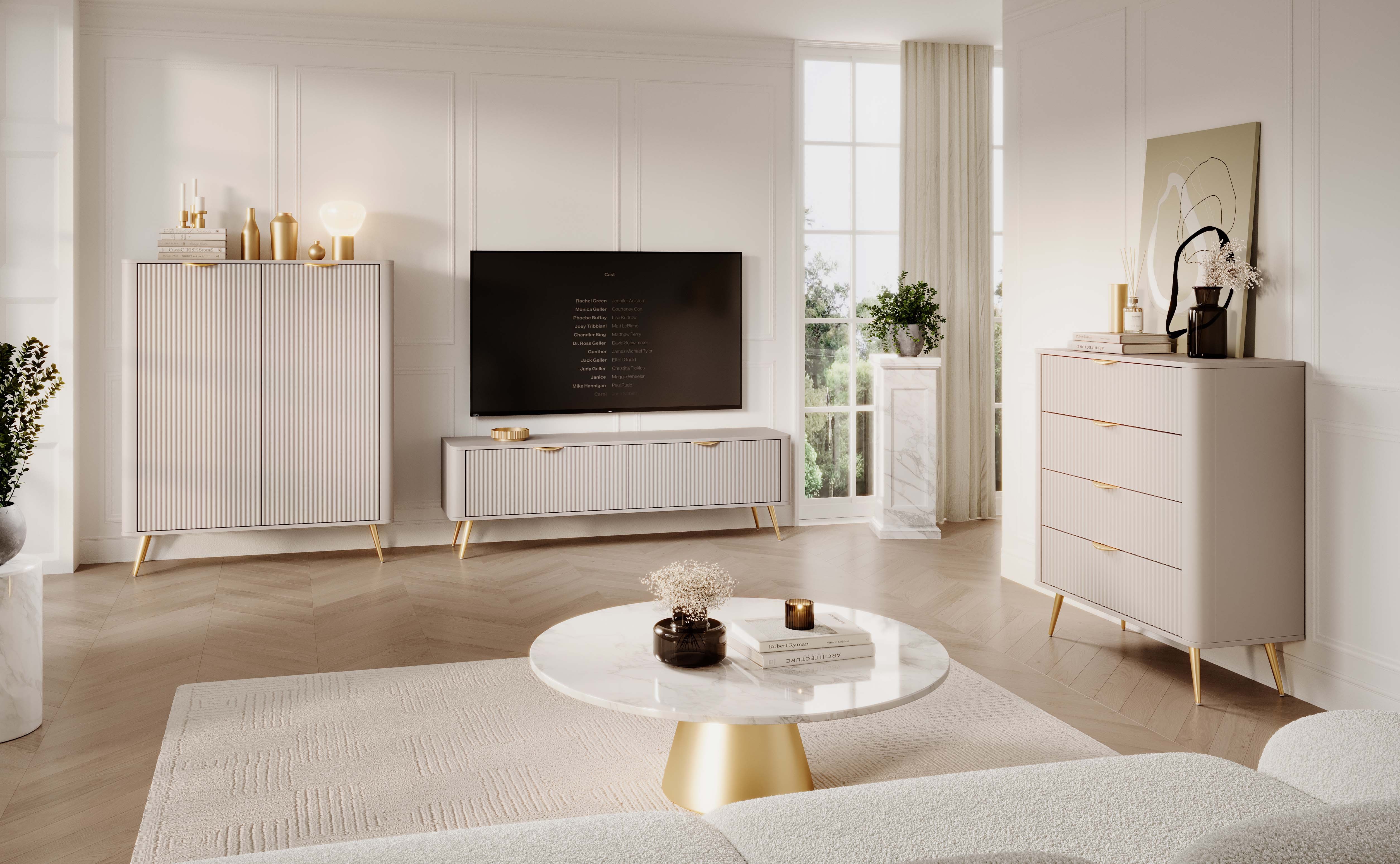 Frezowane fronty oraz delikatnie zaokrąglone krawędzie nadają szafce wyjątkowego wyglądu