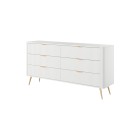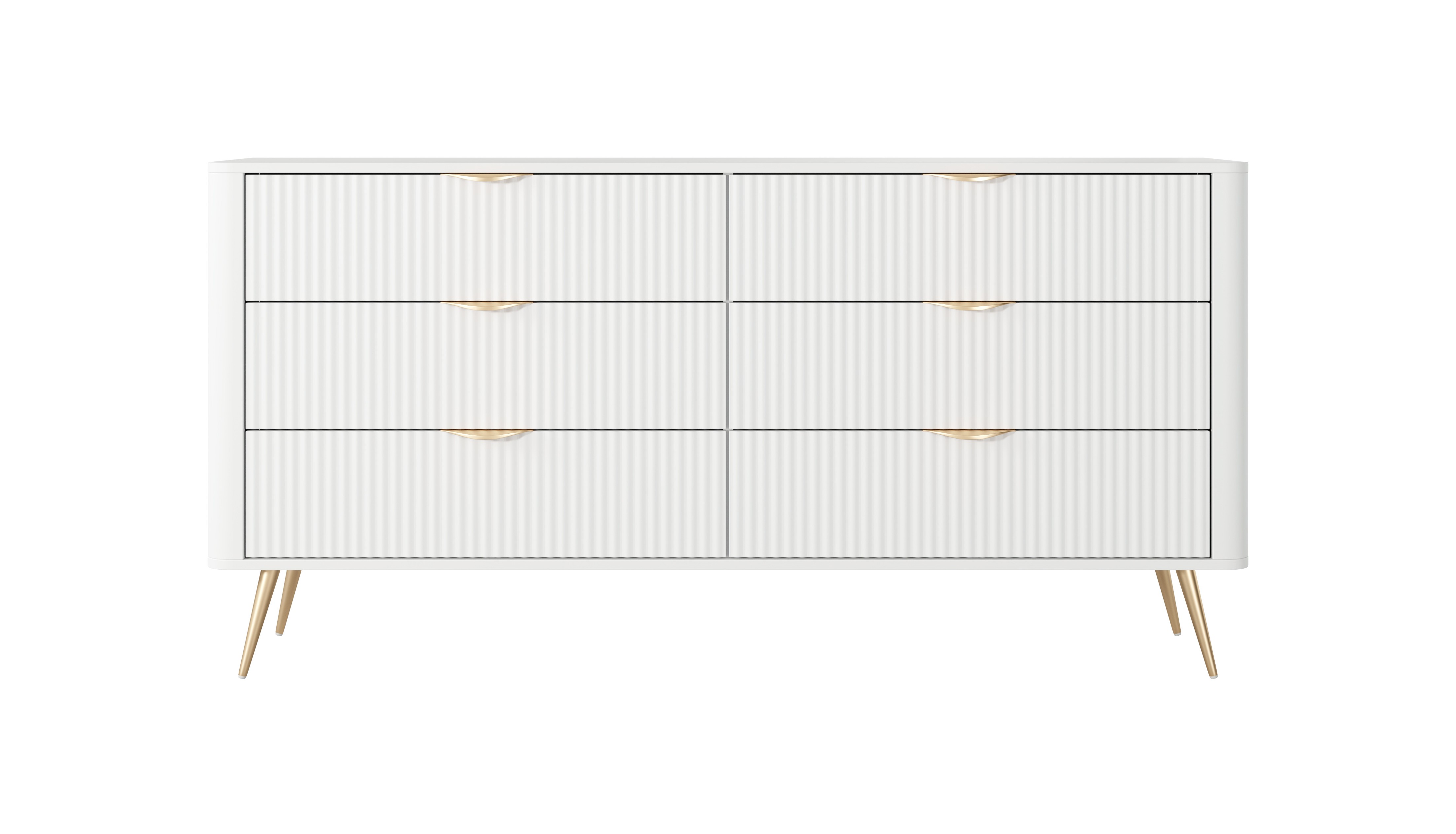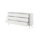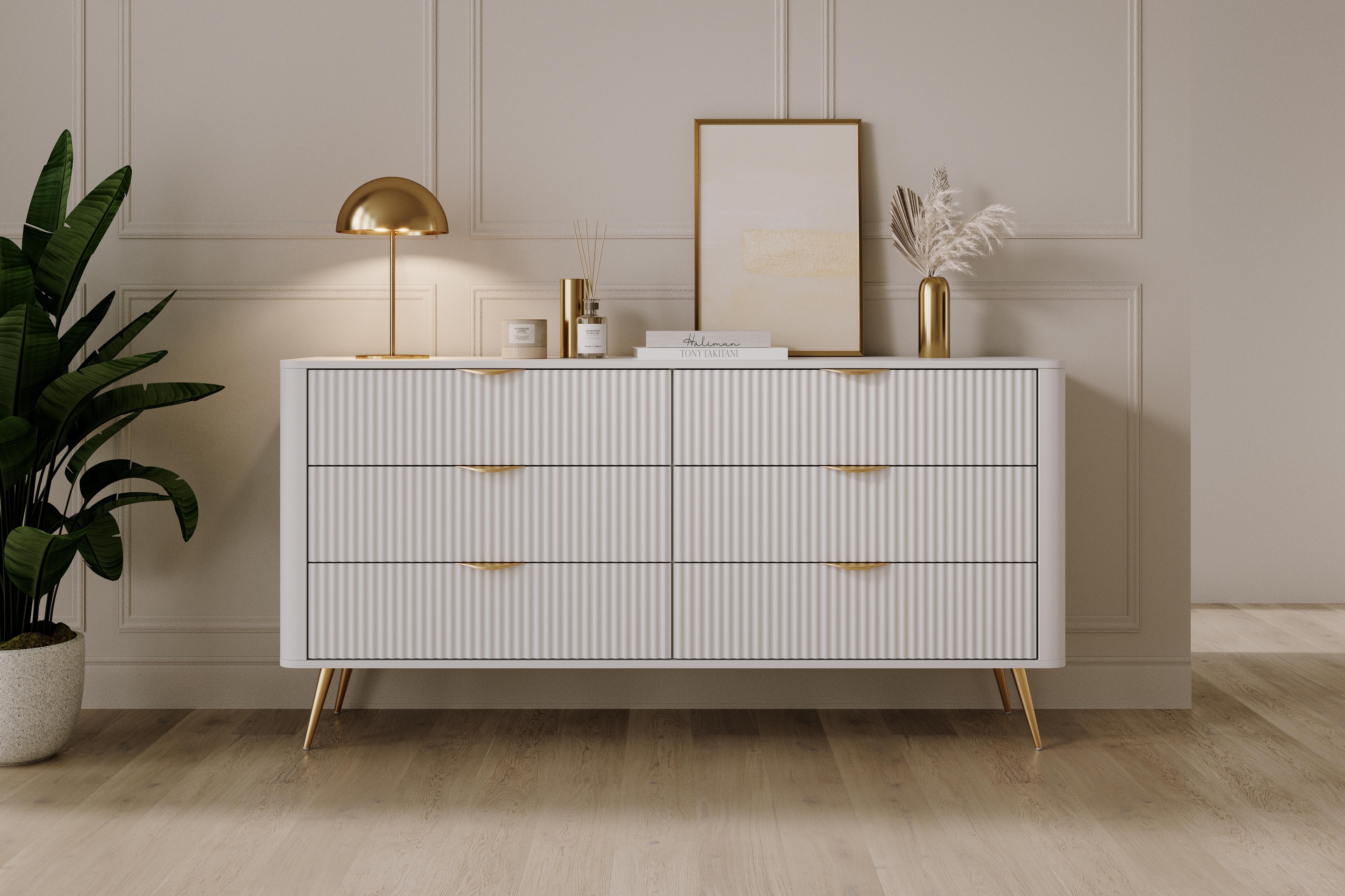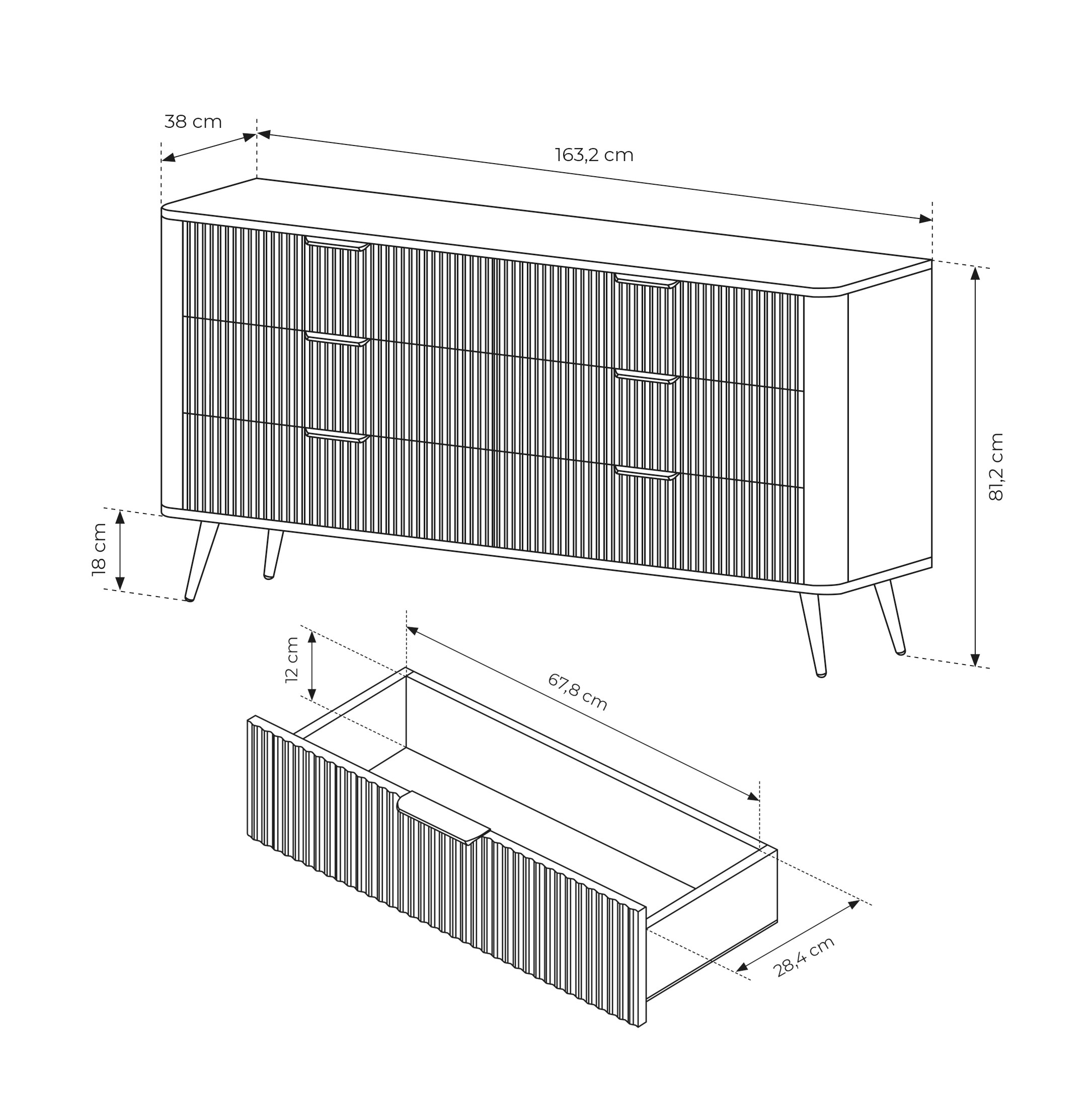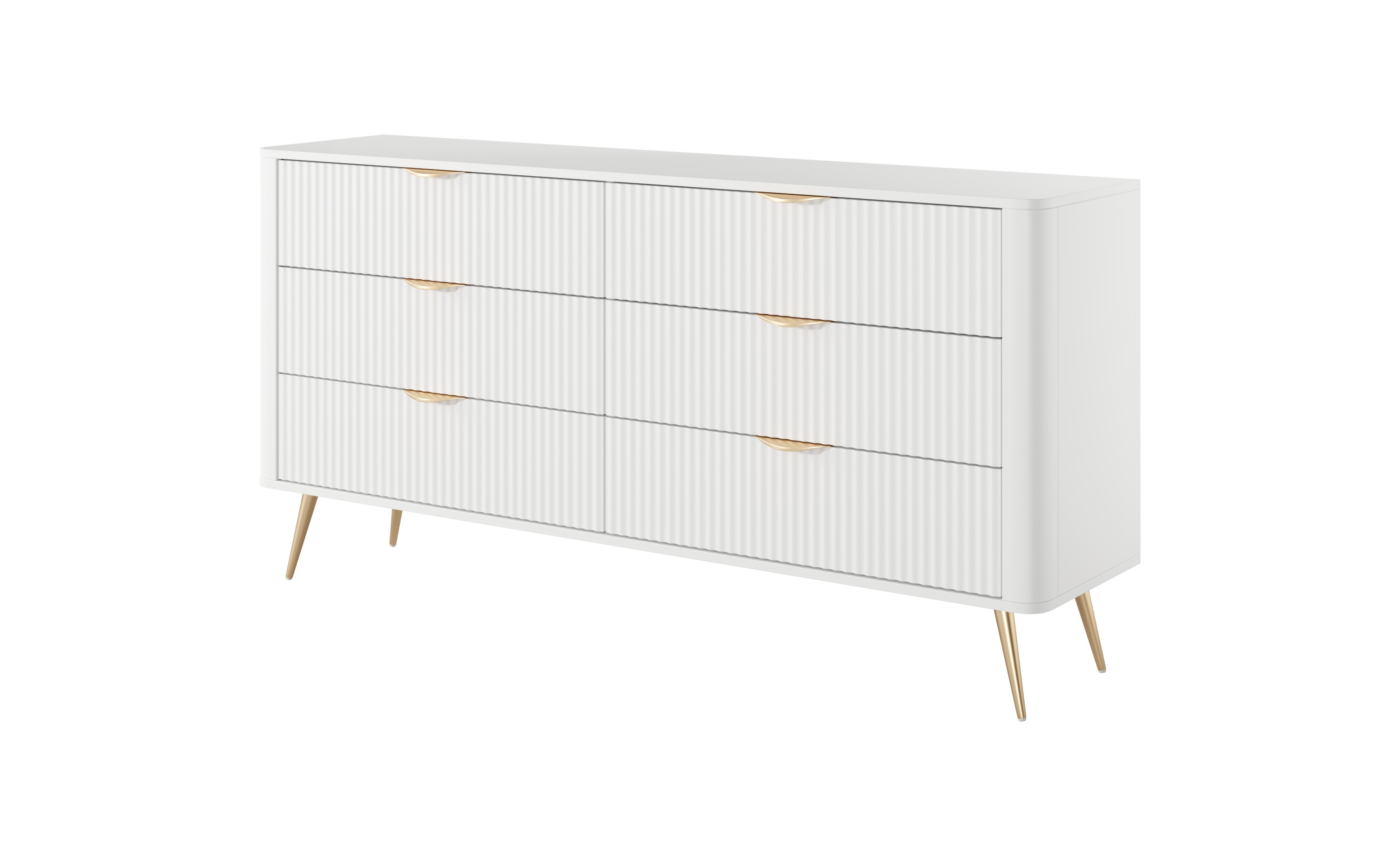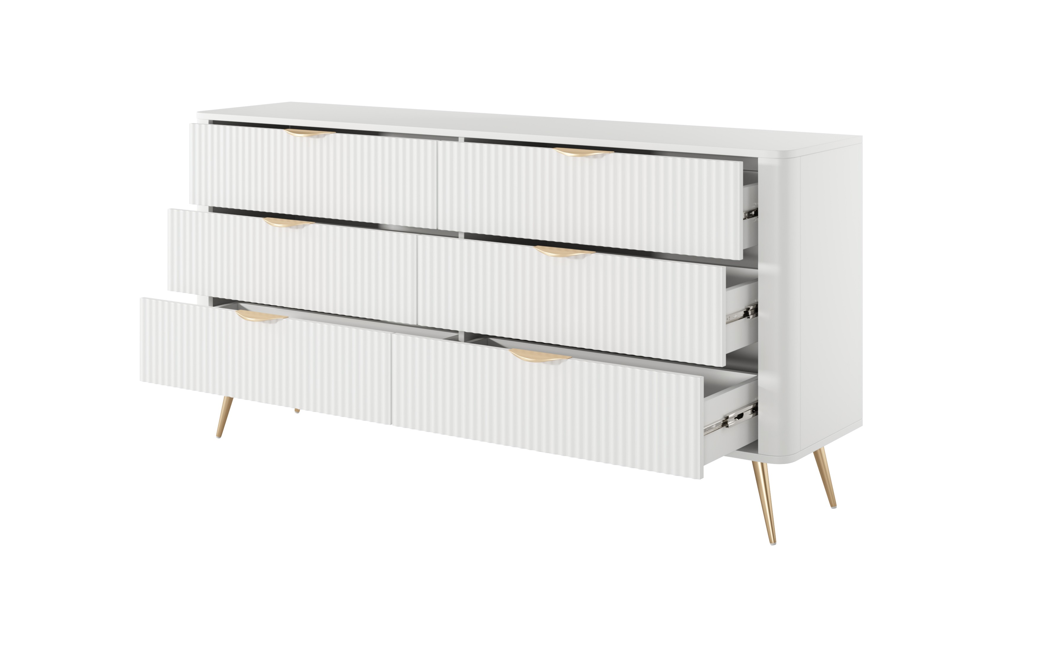 Projekt komody został stworzony z myślą o wygodzie codziennego użytkowania. Sześć pojemnych szuflad zapewnia dużo miejsca na ubrania, dodatki oraz inne niezbędne rzeczy, pomagając utrzymać porządek i organizację w pomieszczeniu.