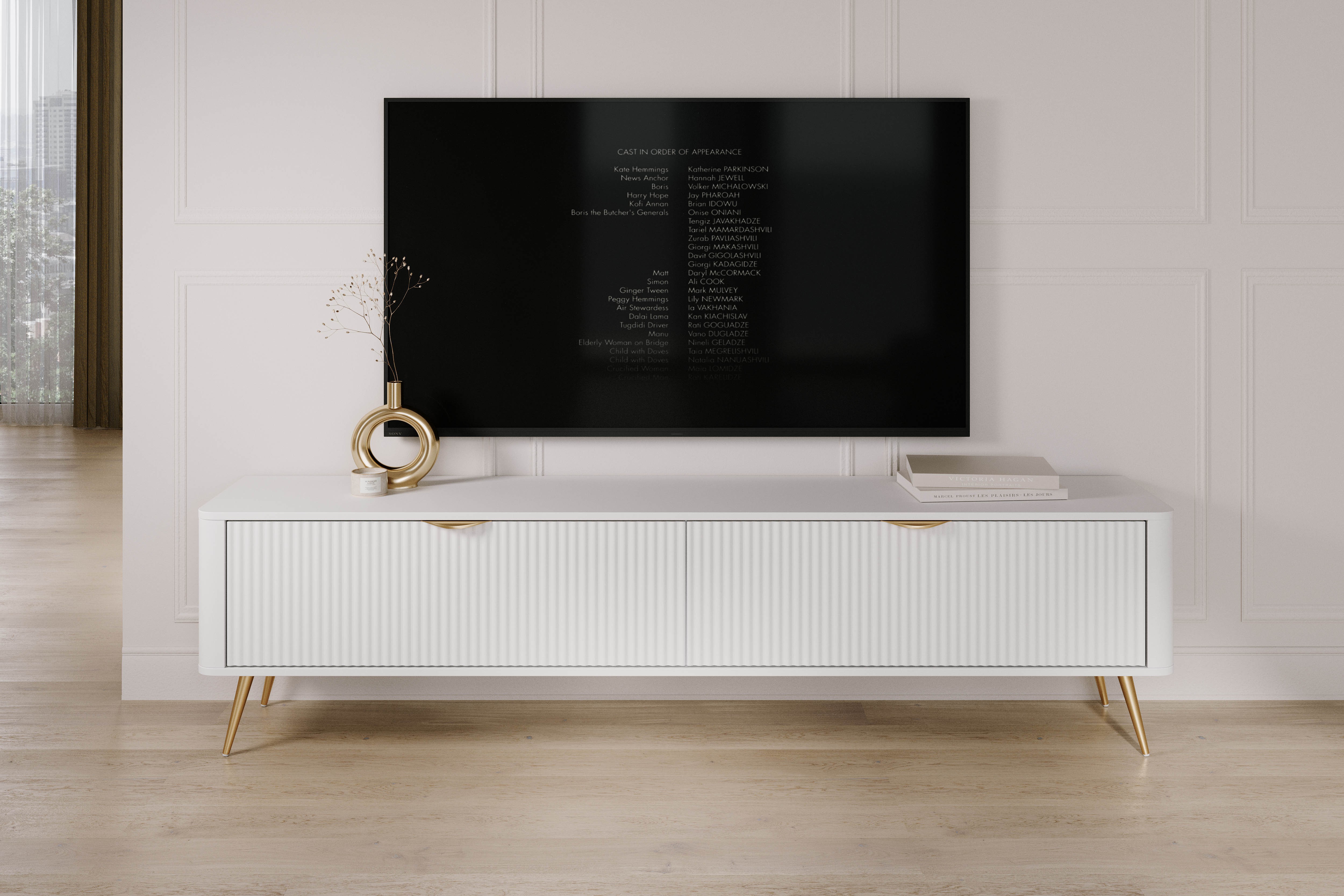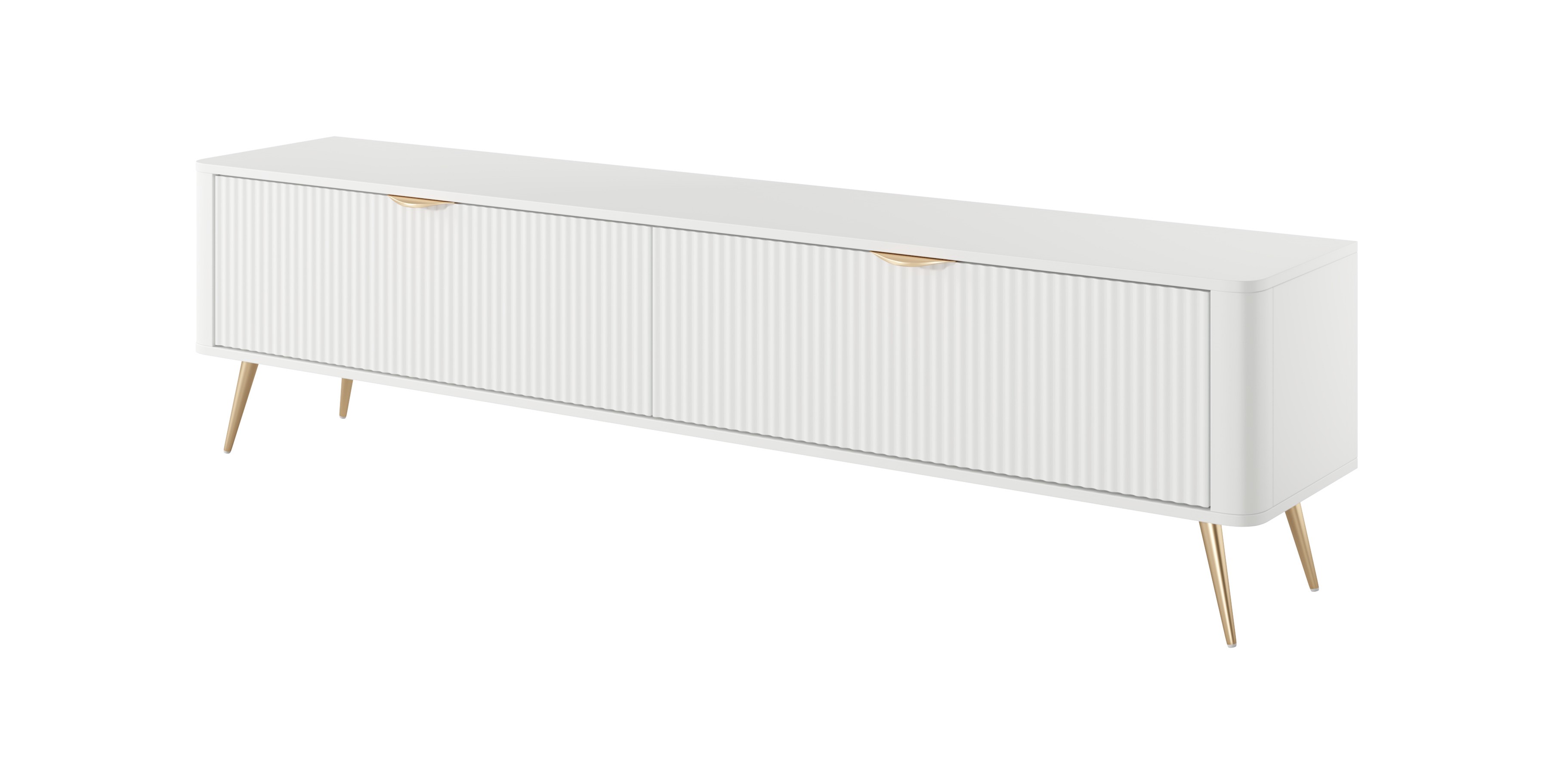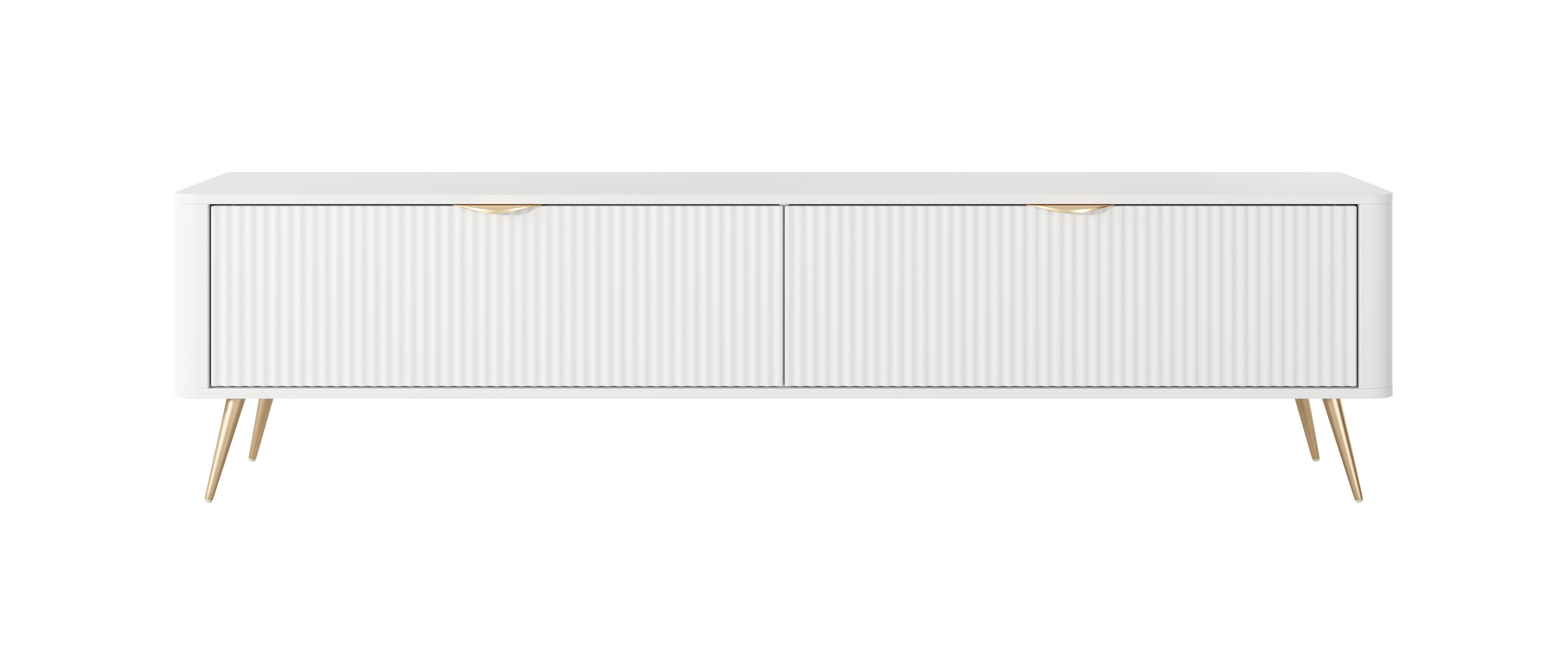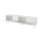 Biała Szafka RTV LETNA 200 cm 2D – szafka pod telewizor na nóżkach do salonu z frezowanymi frontami