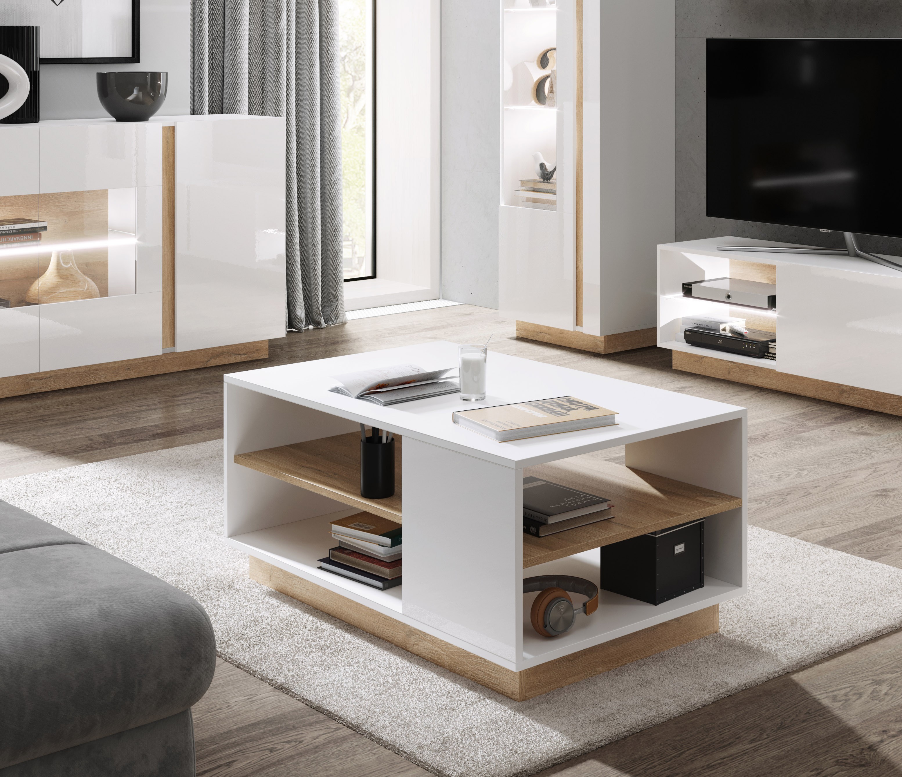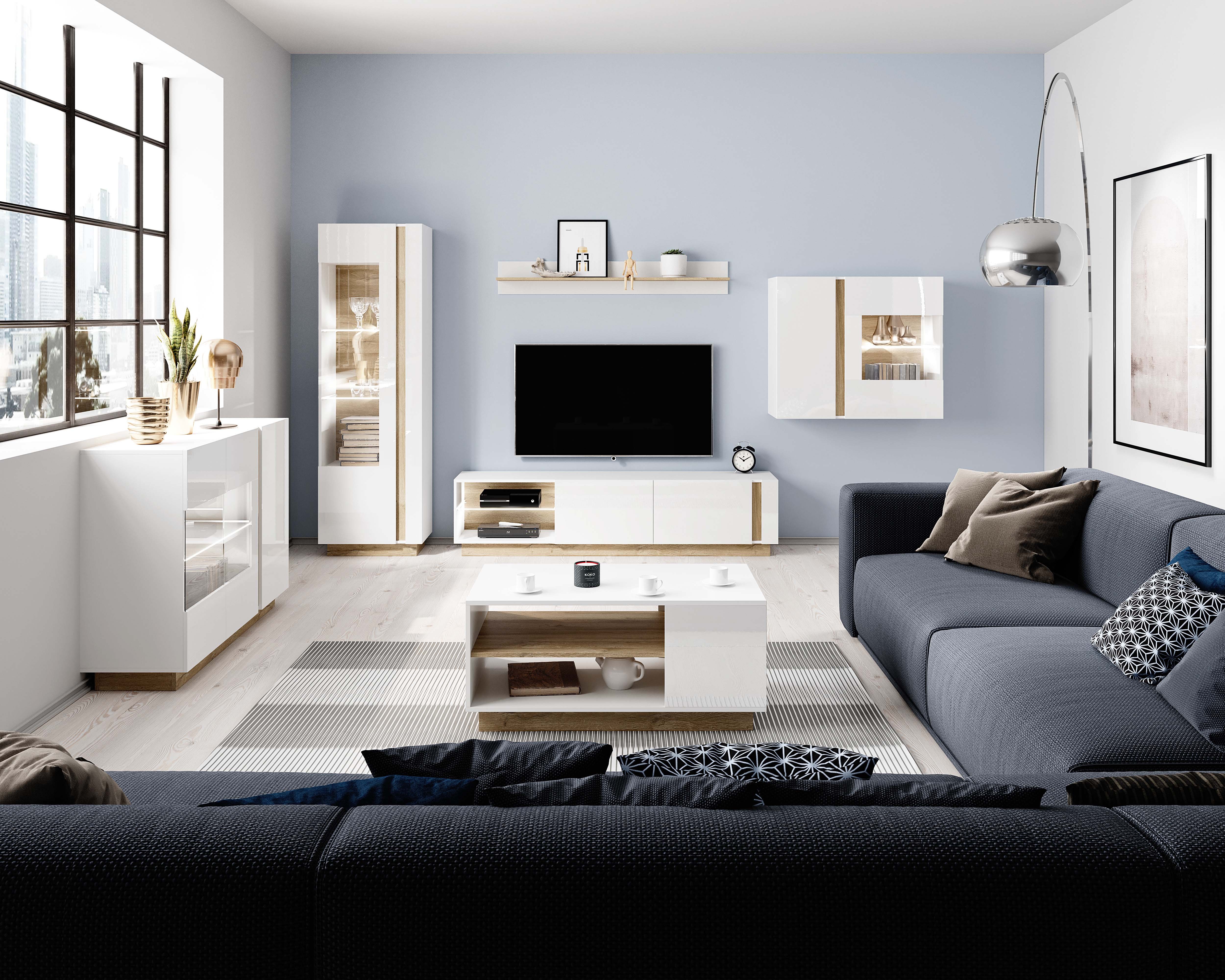 Nowoczesne bryły, szklane półki oraz kontrastowy HDF tworzą spójną i efektowną całość. Kolekcja wyróżnia się dużą różnorodnością elementów, co pozwala na swobodne dopasowanie mebli do indywidualnych potrzeb oraz tworzenie nieograniczonych aranżacji.