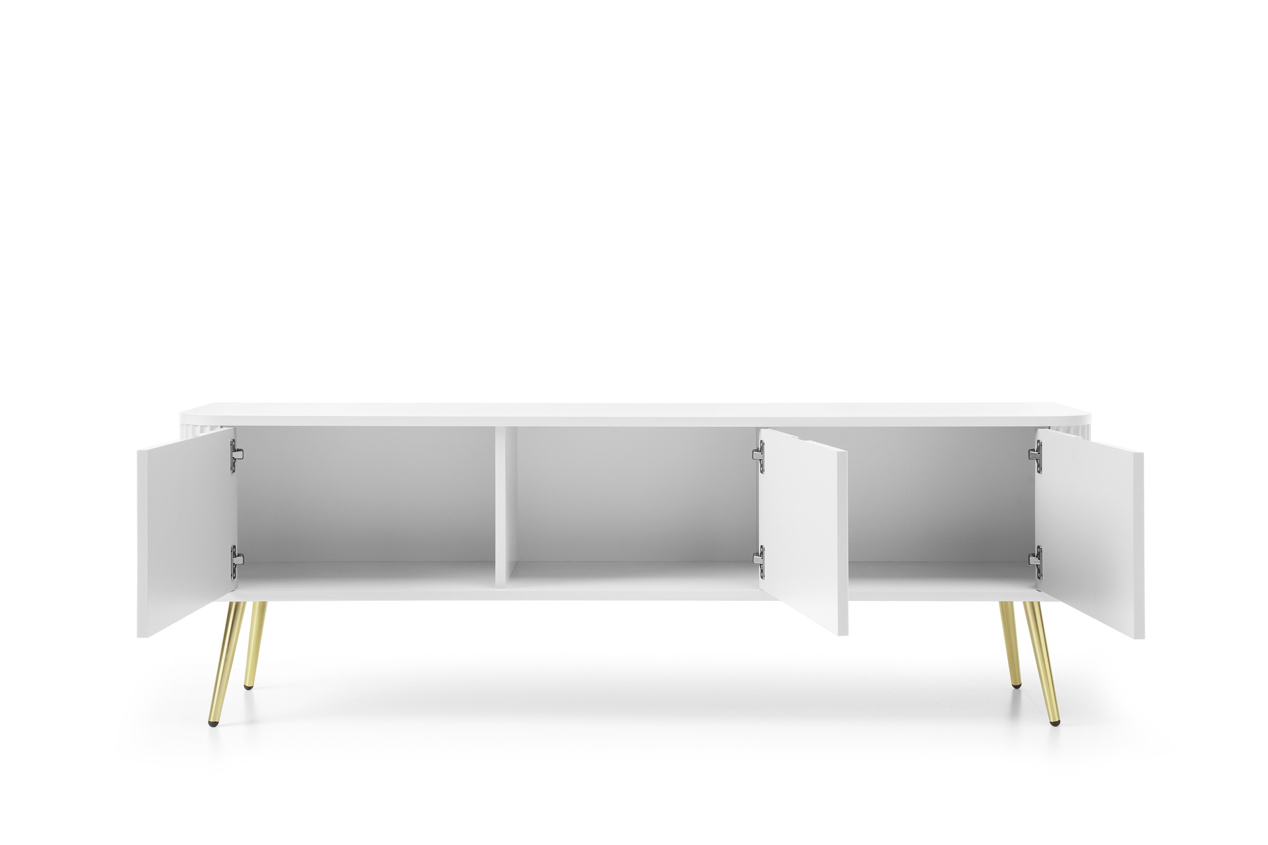 Szafka RTV ZURI to idealne rozwiązanie do salonu, sypialni lub domowego biura. Łączy nowoczesny design z wysoką funkcjonalnością, oferując dużą przestrzeń do przechowywania. Zaokrąglone boki oraz dekoracyjne ryflowania na froncie i korpusie nadają meblowi elegancki, ponadczasowy charakter. Stylowe uchwyty w formie frezowanych wgłębień podkreślają minimalistyczny wygląd bryły.