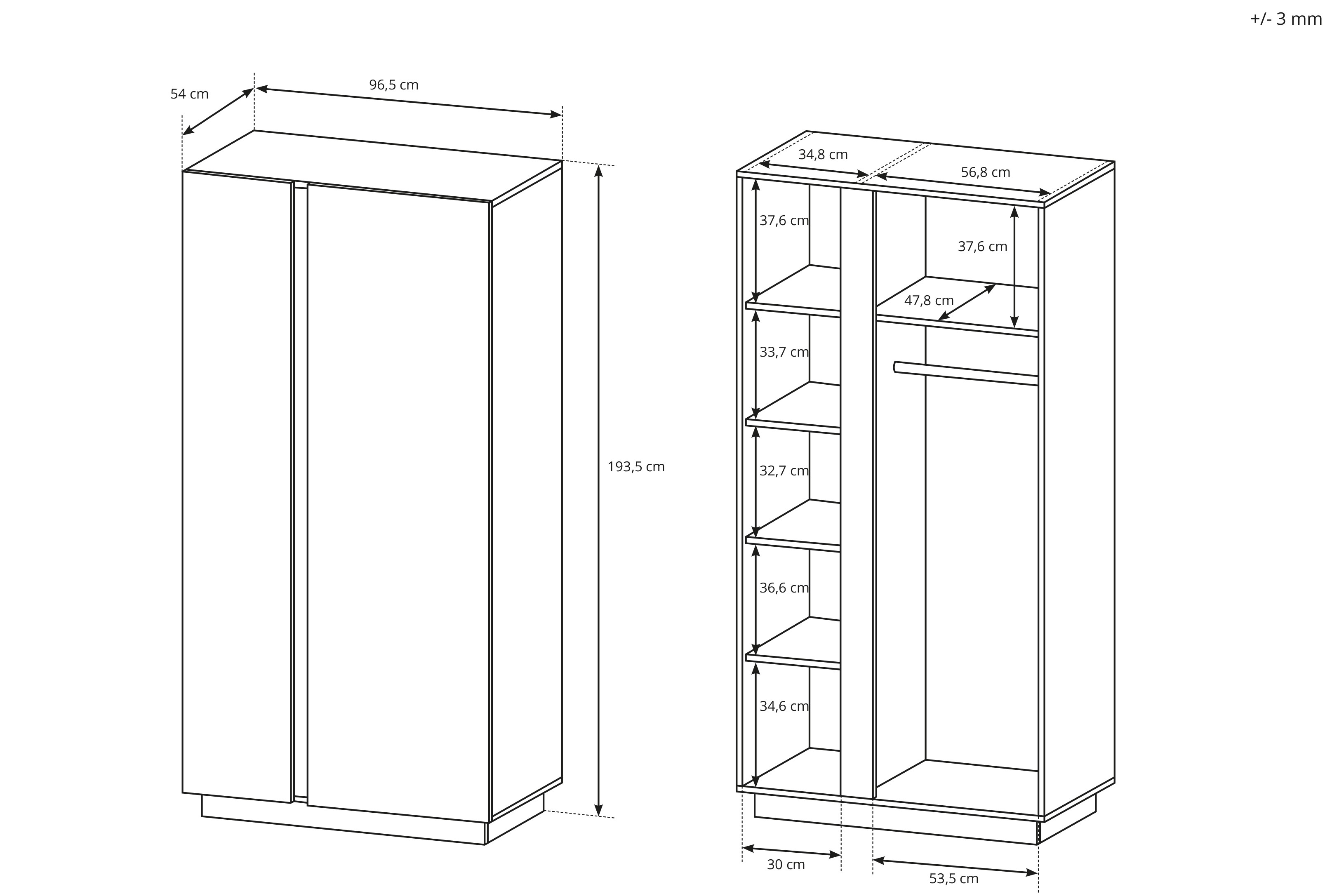 Szafa o szerokości 96 cm (szczegółowe wymiary dostępne w specyfikacji produktu).