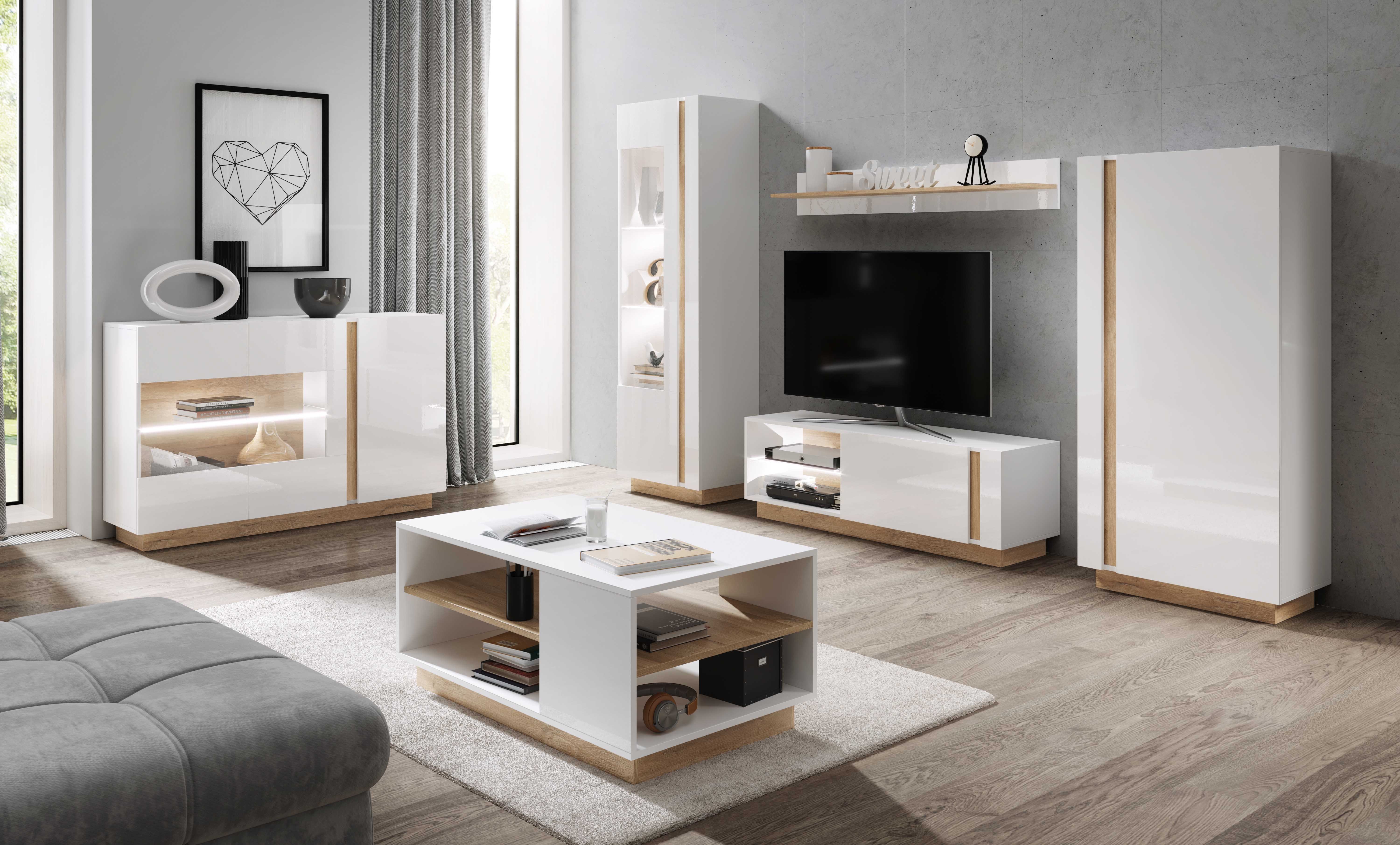 Nowoczesne bryły, szklane półki oraz kontrastowy HDF tworzą efektowną i spójną całość. Kolekcja wyróżnia się bogactwem elementów, dzięki czemu pozwala na tworzenie nieograniczonych aranżacji dopasowanych do indywidualnych potrzeb użytkownika.
