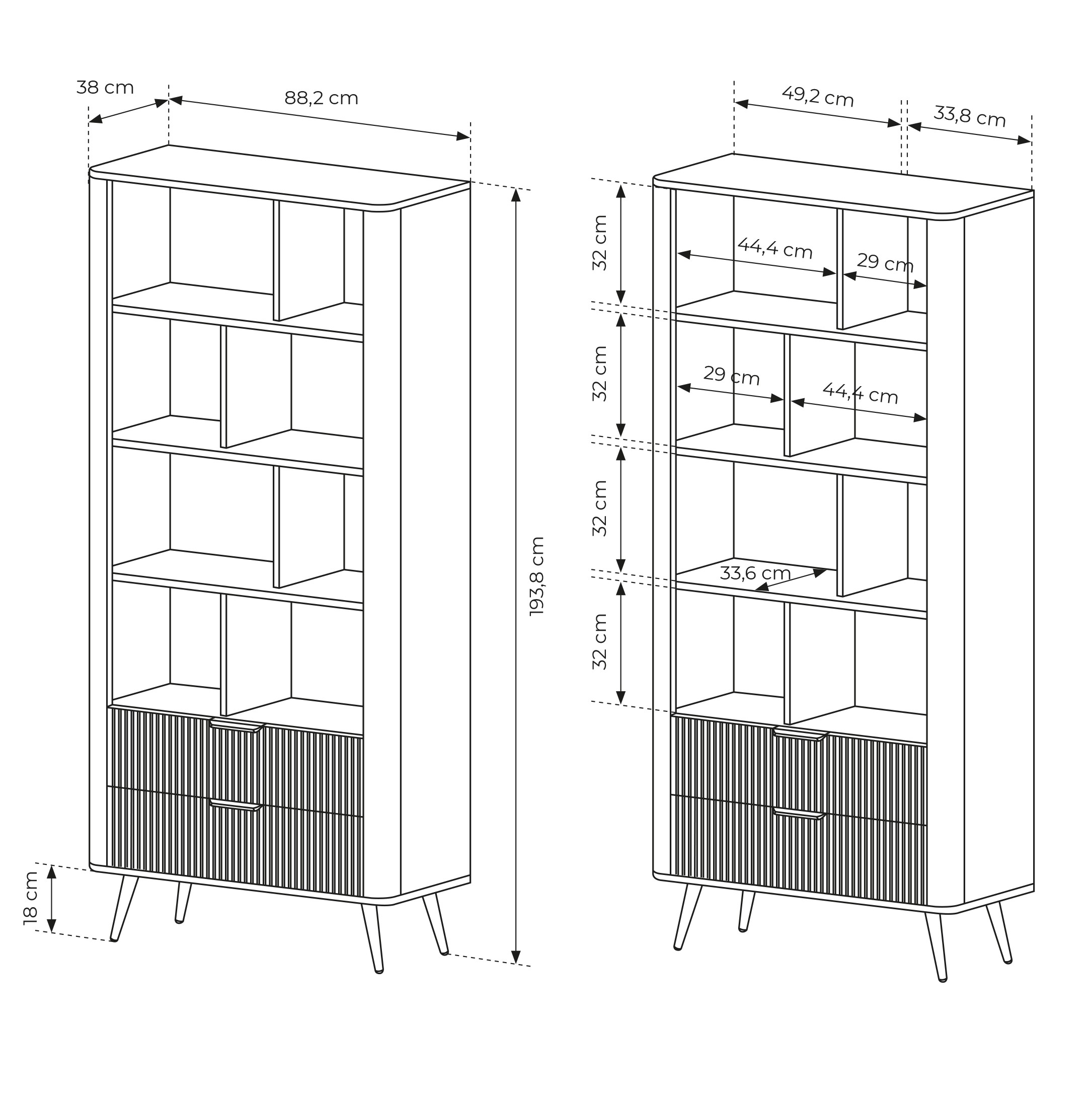Konstrukcja regału opiera się na otwartych półkach oraz dwóch praktycznych szufladach. Półki idealnie nadają się do ekspozycji książek, dekoracji czy codziennych przedmiotów, natomiast szuflady zapewniają dyskretne miejsce do przechowywania mniejszych akcesoriów.