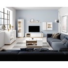 Charakterystyczne dla kolekcji RACO nowoczesne bryły, szklane półki oraz kontrastowy tył z płyty HDF sprawiają, że witryna przyciąga wzrok i nadaje wnętrzu wyjątkowego charakteru. Dodatkowym atutem mebla jest oświetlenie LED – podświetlane półki, które efektownie eksponują zawartość i tworzą elegancki, nowoczesny klimat we wnętrzu. Dzięki uniwersalnej stylistyce mebel pasuje do różnych aranżacji – od minimalistycznych po klasyczne.