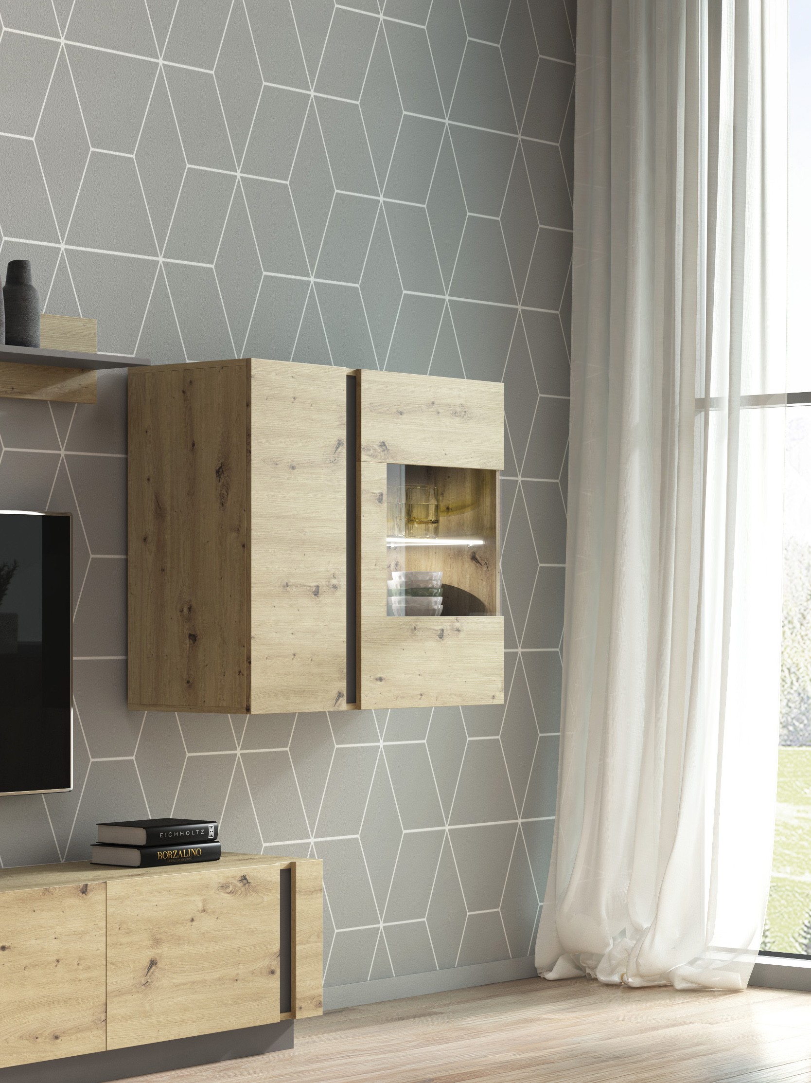 Witryna wisząca RACO to nowoczesny i funkcjonalny mebel, łączący ekspozycję i przechowywanie w kompaktowej formie. Dzięki montażowi na ścianie oszczędza miejsce i ułatwia organizację wnętrza, doskonale sprawdzając się w salonie, jadalni lub kuchni.